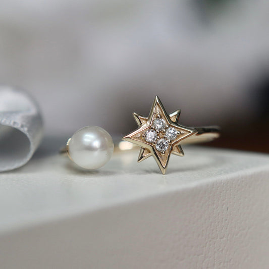 Bague Étoile du Nord en or 10K, perle et moissanites