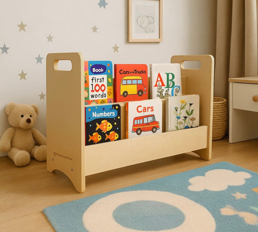 Double-Sided Wooden Montessori Bookshelf for Kids | Book Storage for kids