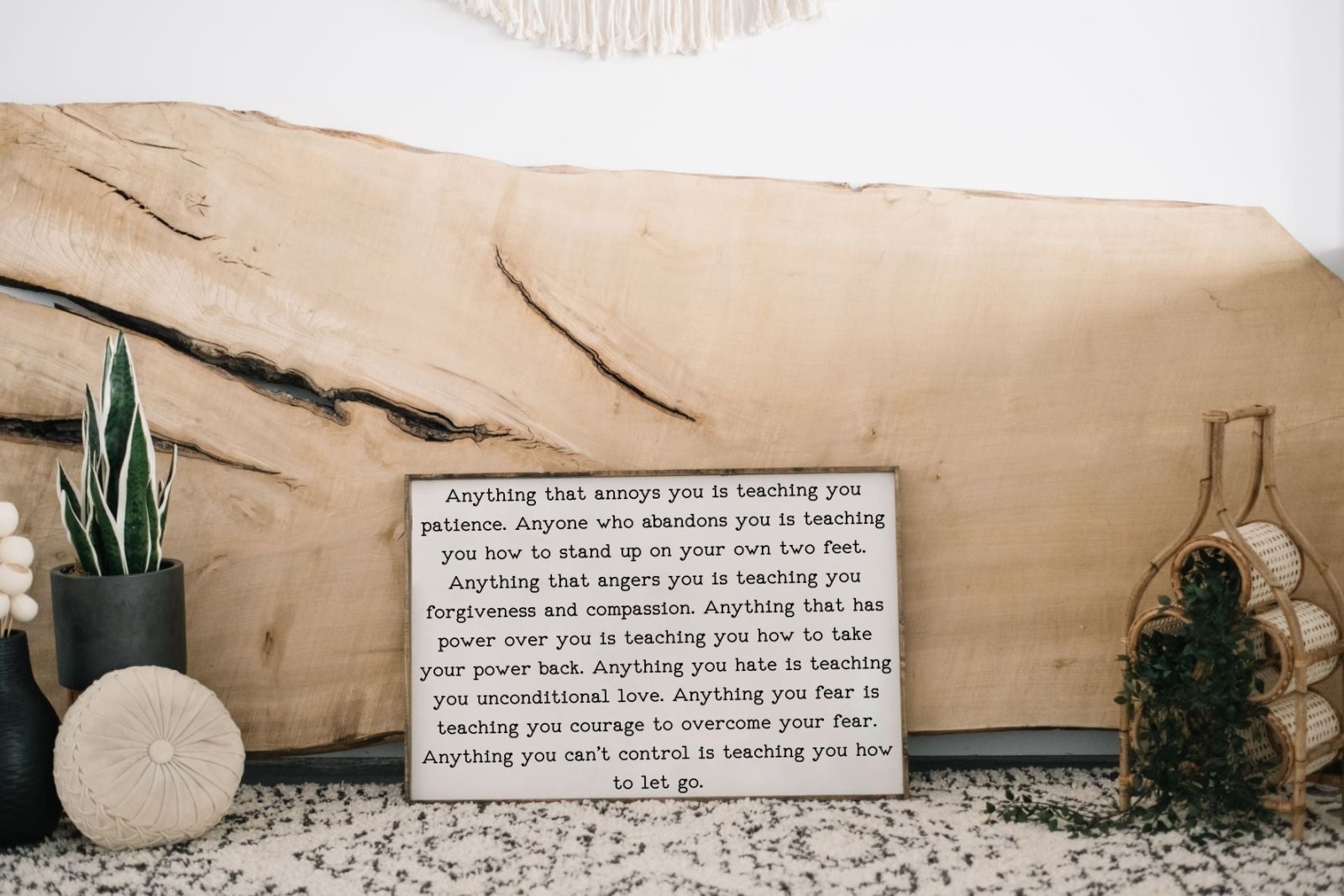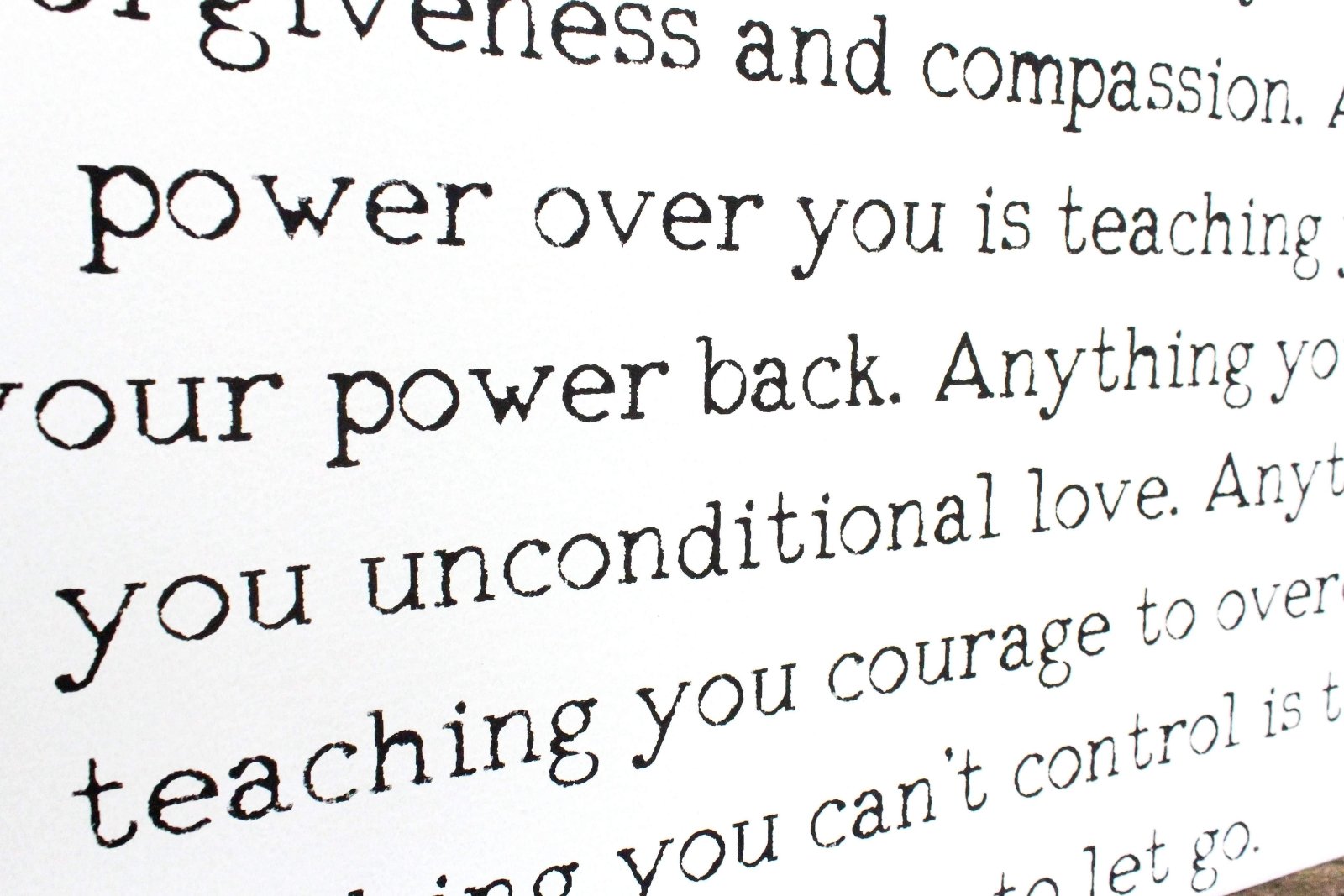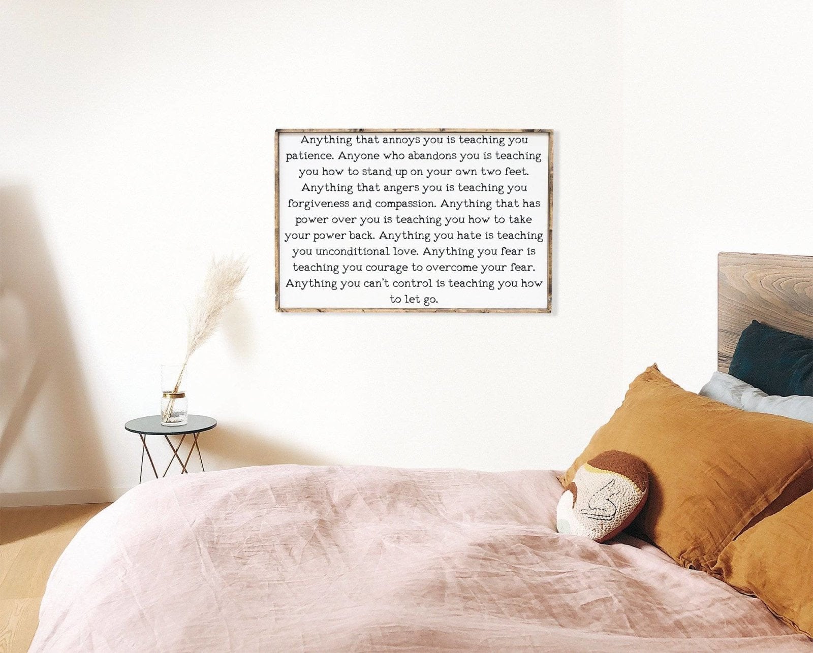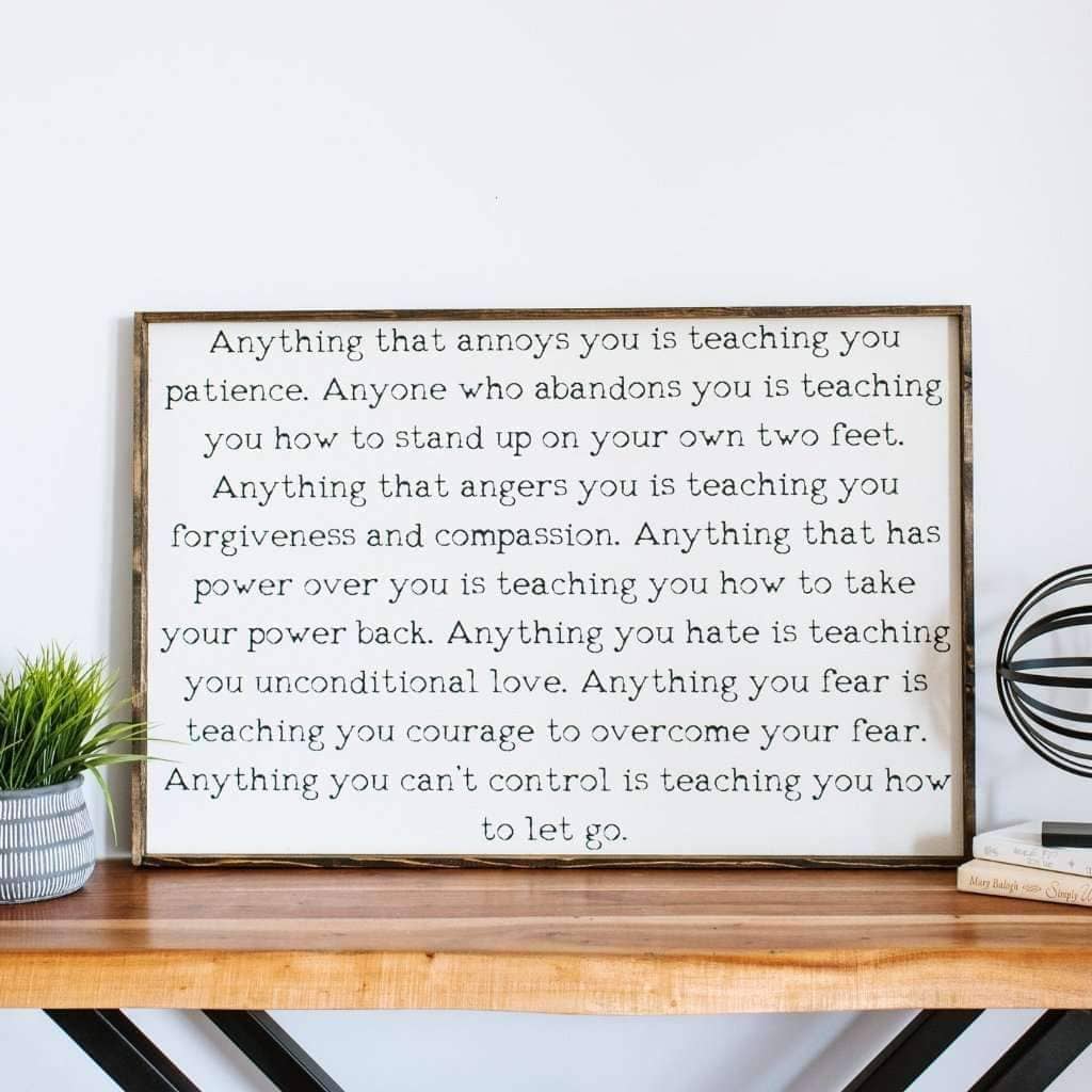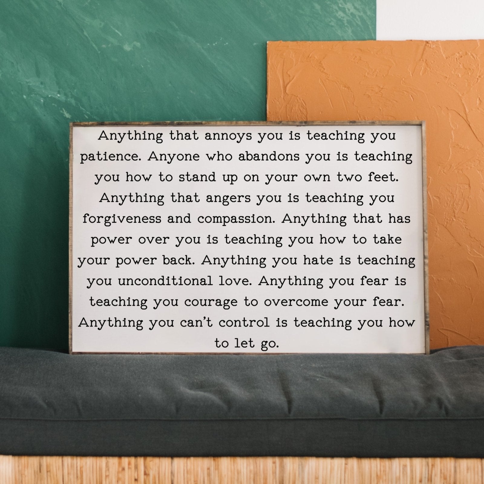 "anything that annoys you is teaching you patience. Anyone who abandons you is teaching you how to stand on your own two feet. Anything that angers you is teaching you forgiveness and compassion. Anything that has power over you is teaching you how to take your power back. Anything you hate is teaching you unconditional love. Anything you fear is teaching you courage to overcome your fear. Anything you can't control is teaching you how to let go. "