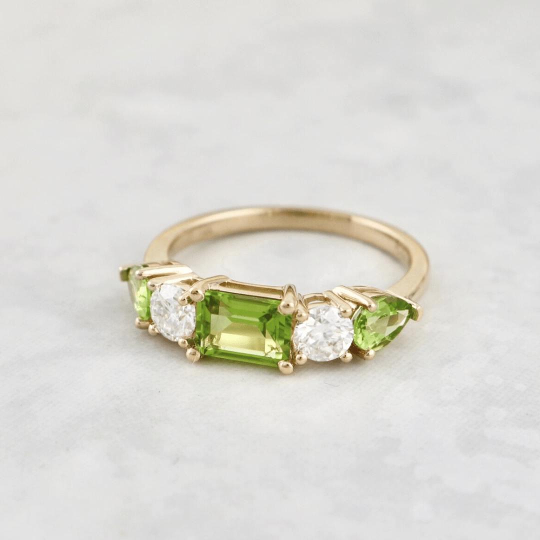 Bague avec péridots et diamants de laboratoire Cette bague unique présente un péridot naturel de taille émeraude en son centre, encadré par deux diamants de laboratoire et deux péridots en forme de poire, pour un design élégant et peu conventionnel.