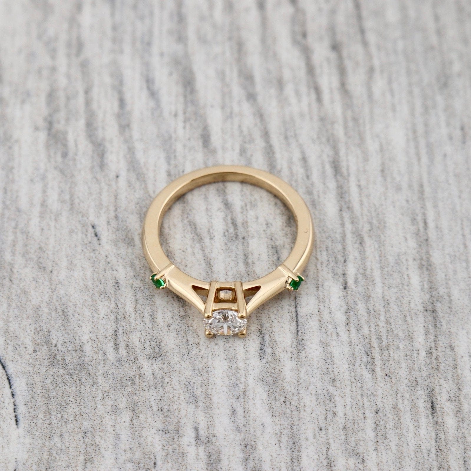 La bague solitaire met en valeur un diamant central de 0,50 ct (naturel sur les photos), accompagné de deux émeraudes délicatement serties. Le jonc assorti, légèrement courbé, est orné de deux émeraudes naturelles, créant une continuité élégante et raffinée.
