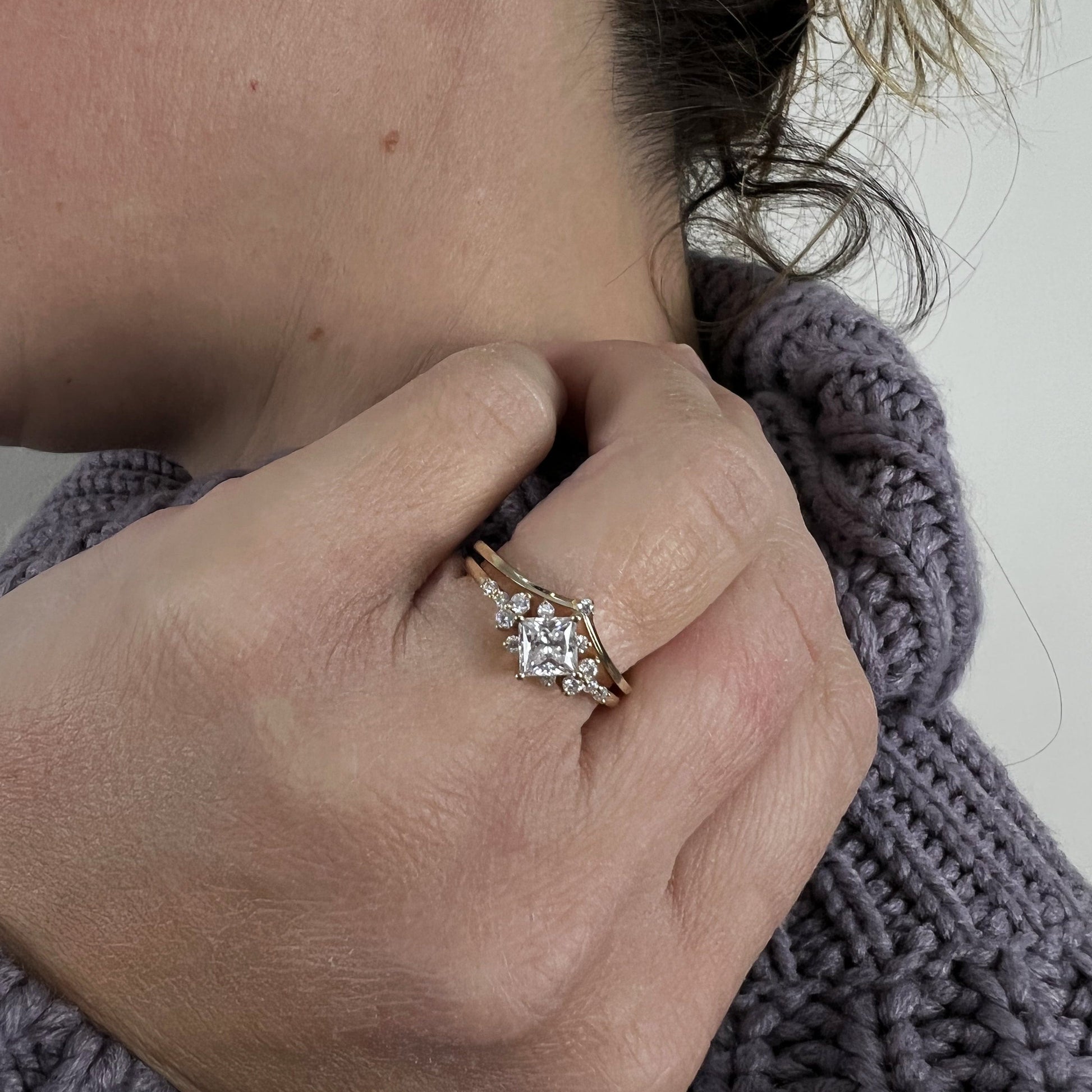 Dites-lui que votre cœur lui appartient avec ce duo de bagues solitaire et alliance exceptionnelle Mathieu Blanchard Signature. Conçu en or 10K, ce duo de bagues met en valeur 1 moissanite coupe princesse 5 x 5 mm (0,8 ct) et 13 moissanites 2 - 2.5 mm, conçue en laboratoire et serties sur griffes.