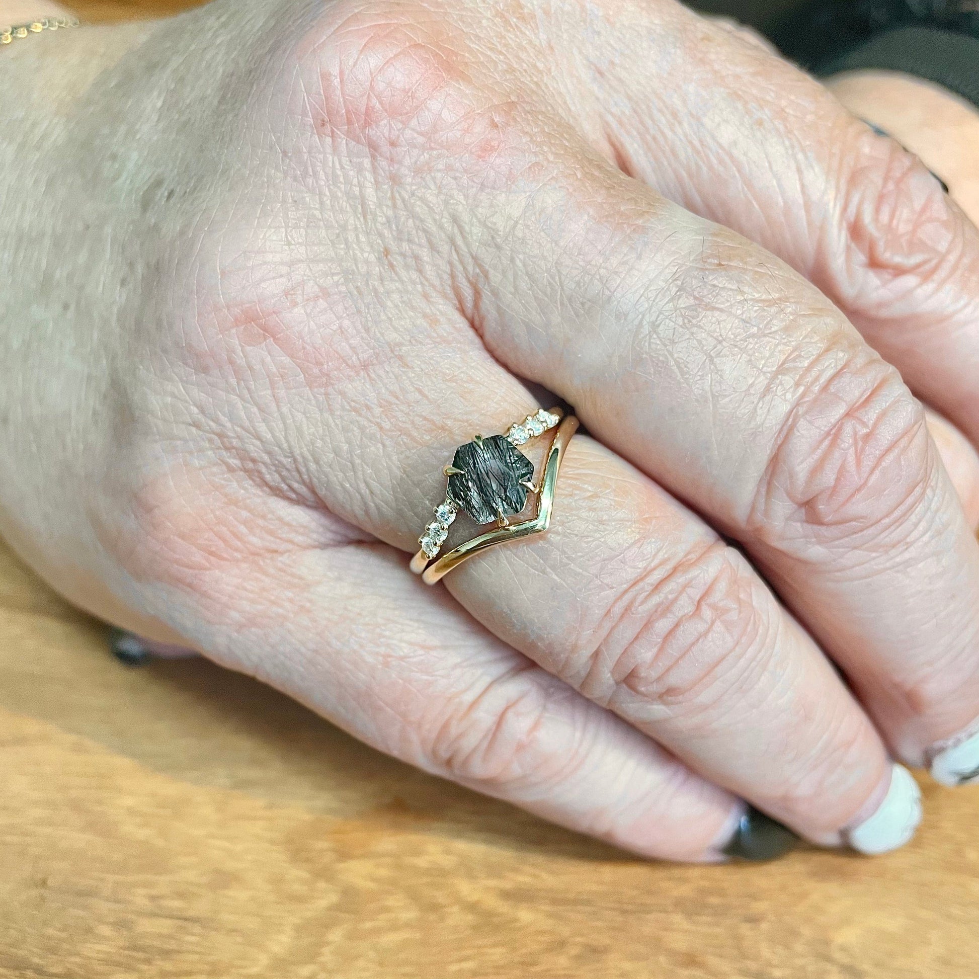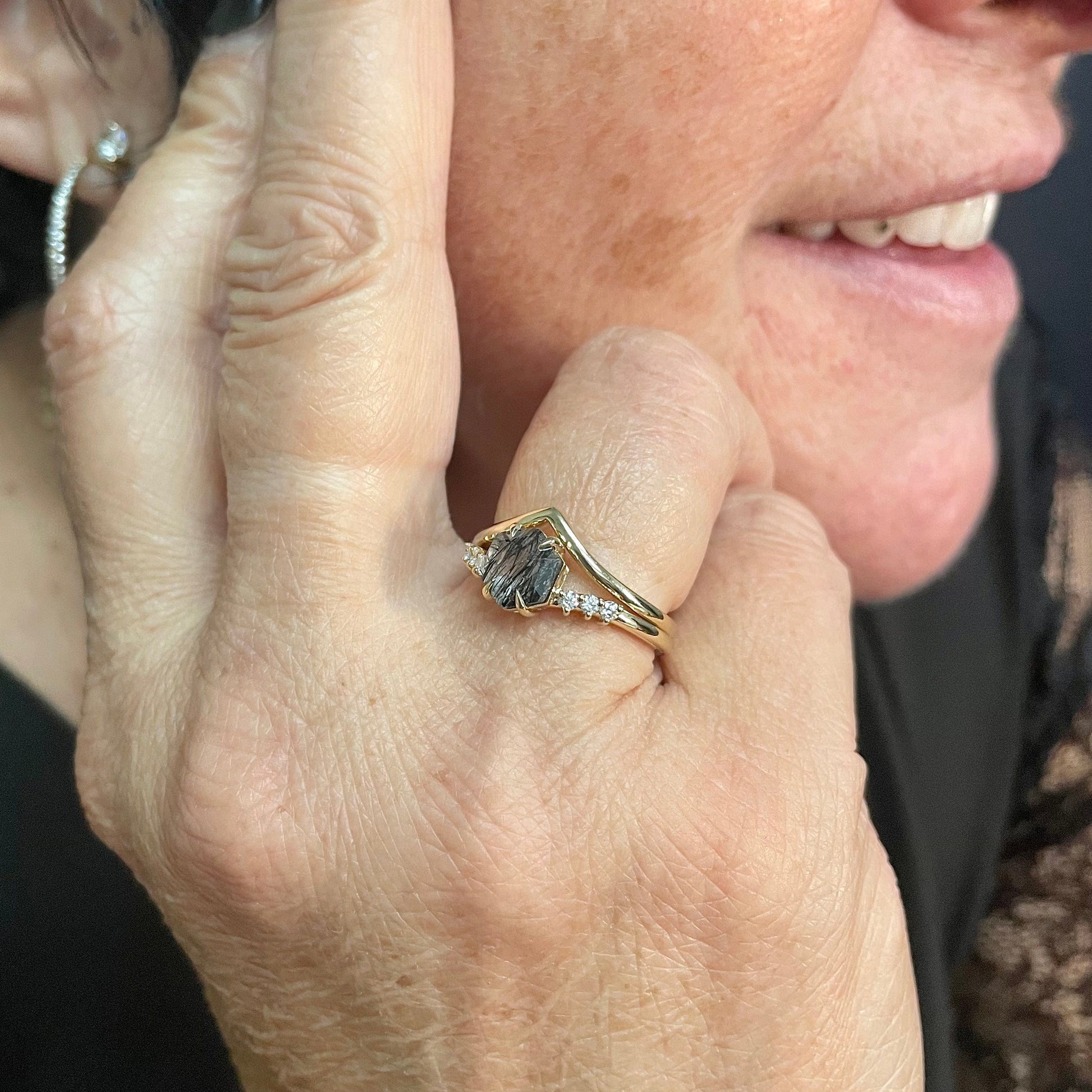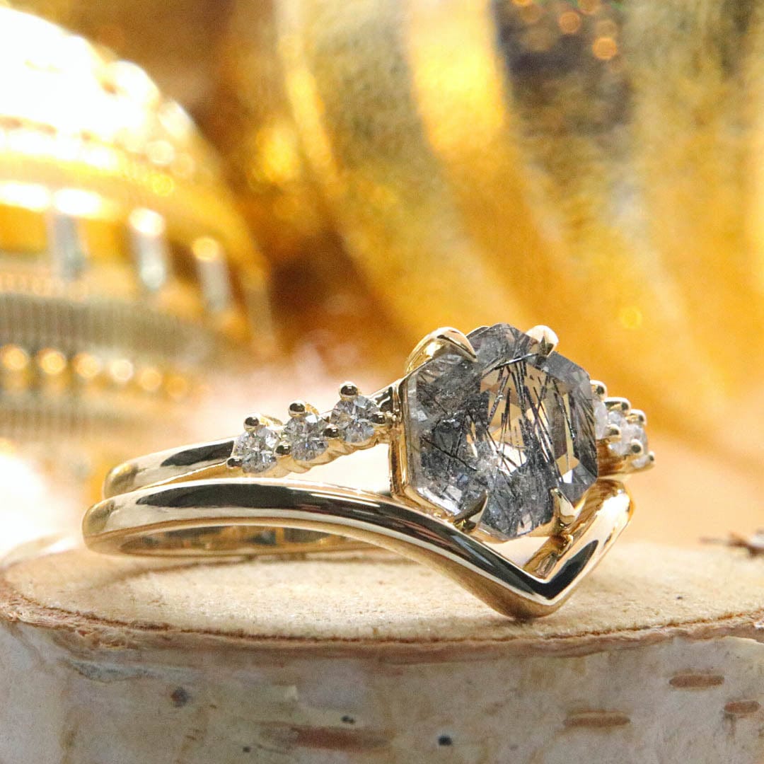 Dites-lui que votre cœur lui appartient avec ce duo de bagues solitaire et alliance exceptionnelle Mathieu Blanchard Signature. Conçu en or 10K, ce duo de bagues met en valeur une pierre centrale quartz rutile et de scintillantes moissanite rondes.