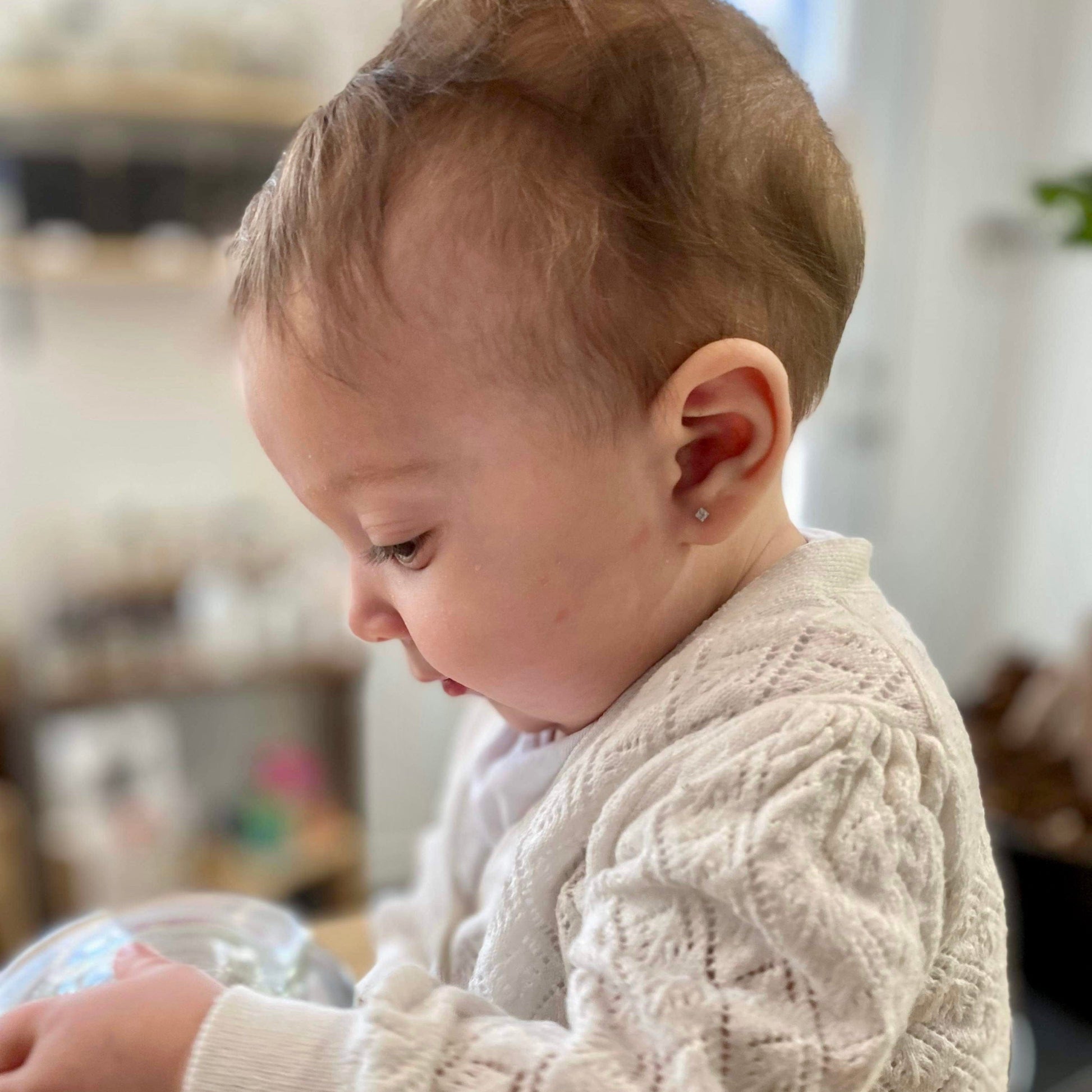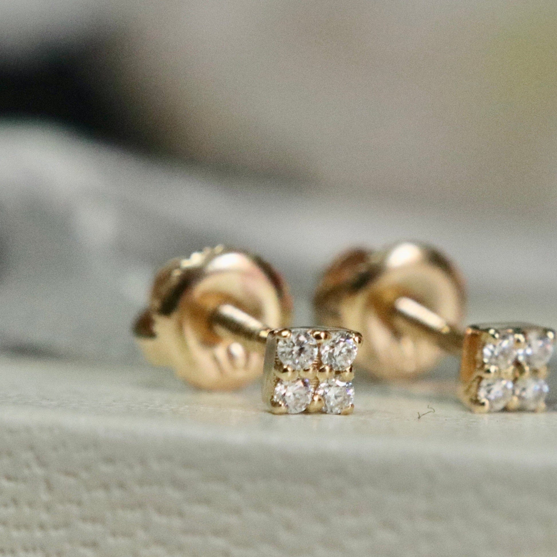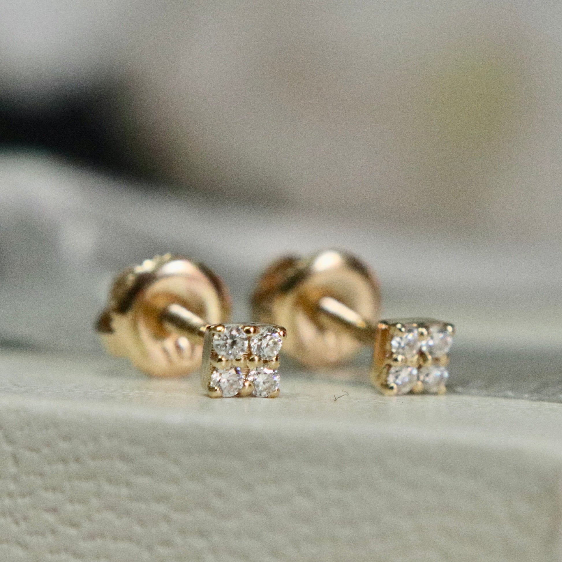 Paire de boucles d'oreilles Les mini Carrés avec moissanites serties sur or 10K, avec tiges et fermoirs vissés à l'arrière. Elles sont parfaites et confortables pour un enfant, mais également pour un adolescent ou adulte.
