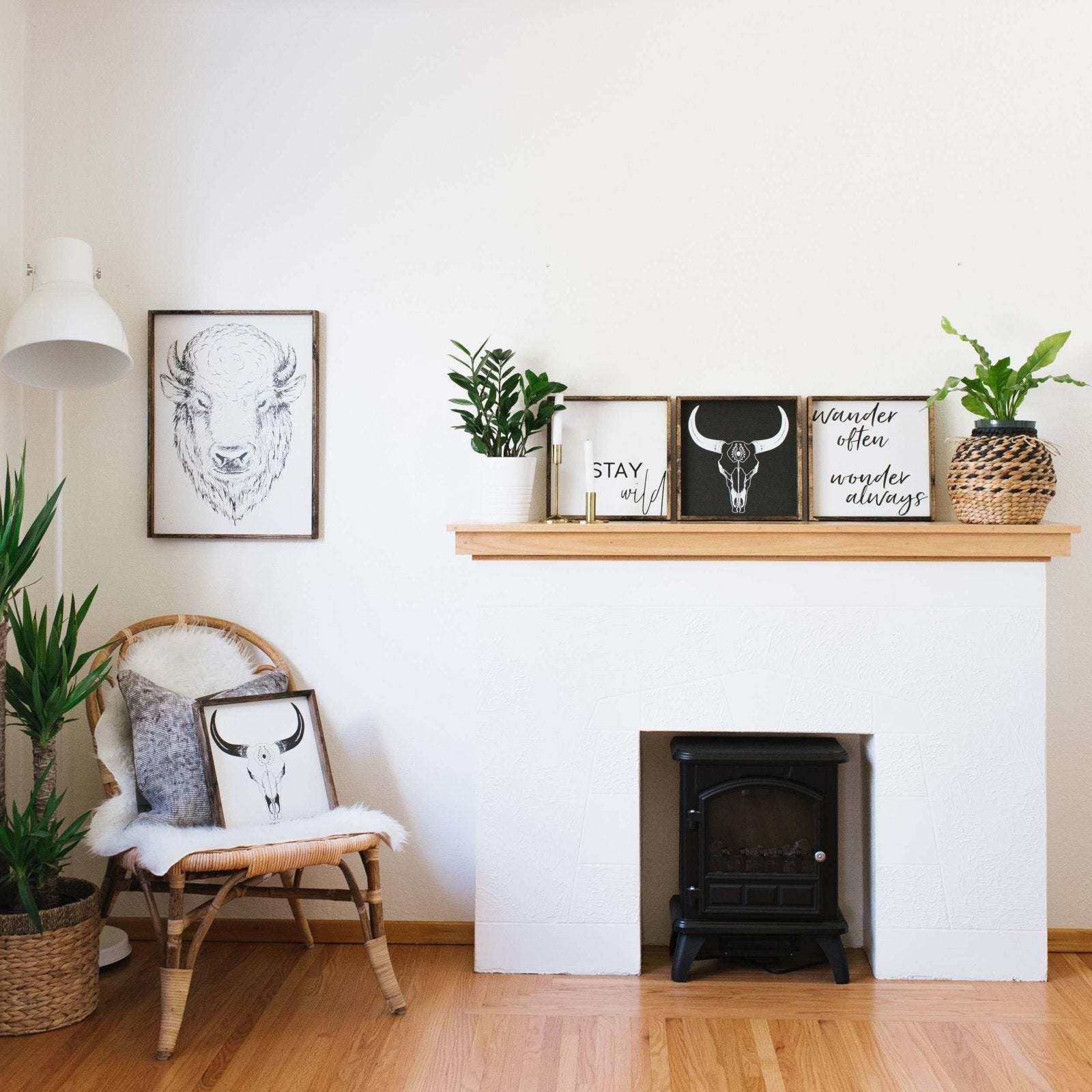 we are all crushing on this buffalo wood sign. We've even named him earl! earl is larger and can hang nicely by himself or sit on a mantel. The small details in the design create lasting character. Plus the natural wood frame provides great texture and seems to fit perfectly with earl.