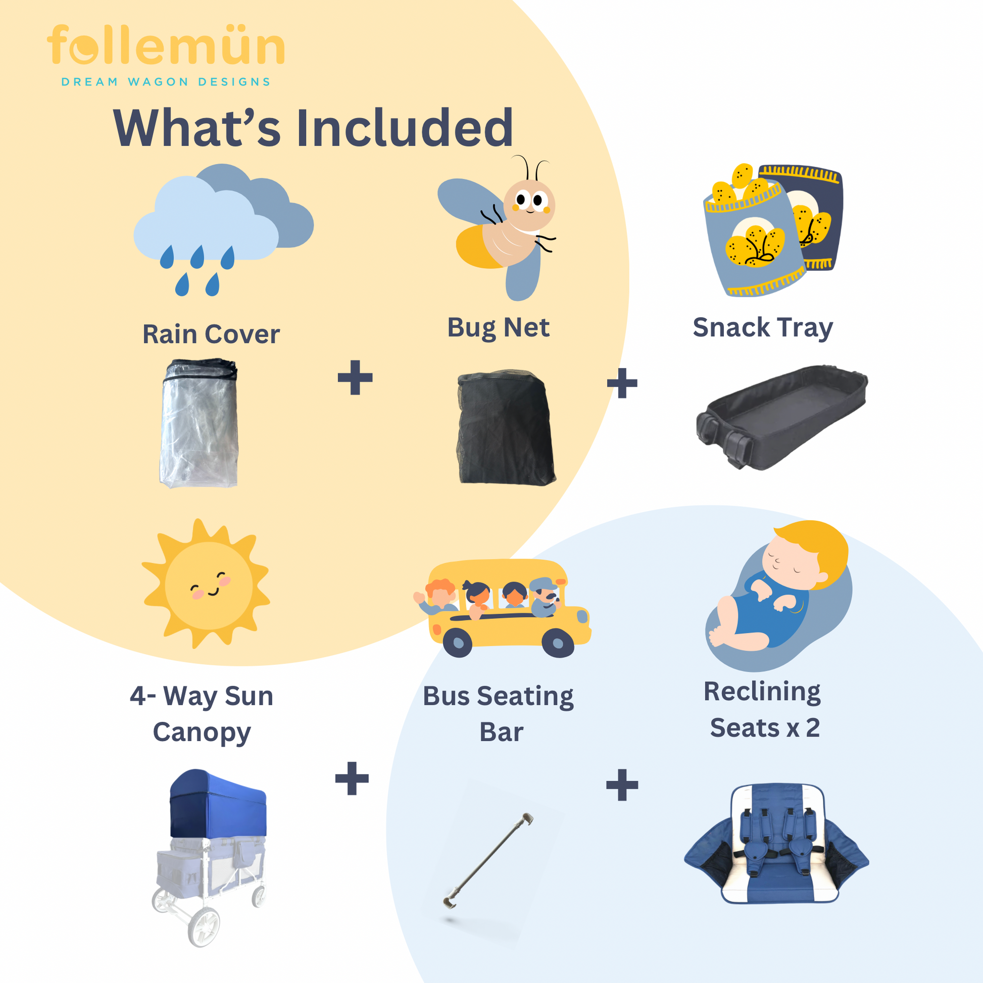 Comes with: rain cover, bug net, snack tray, four sided canopy, forward facing bar, and reclining seats