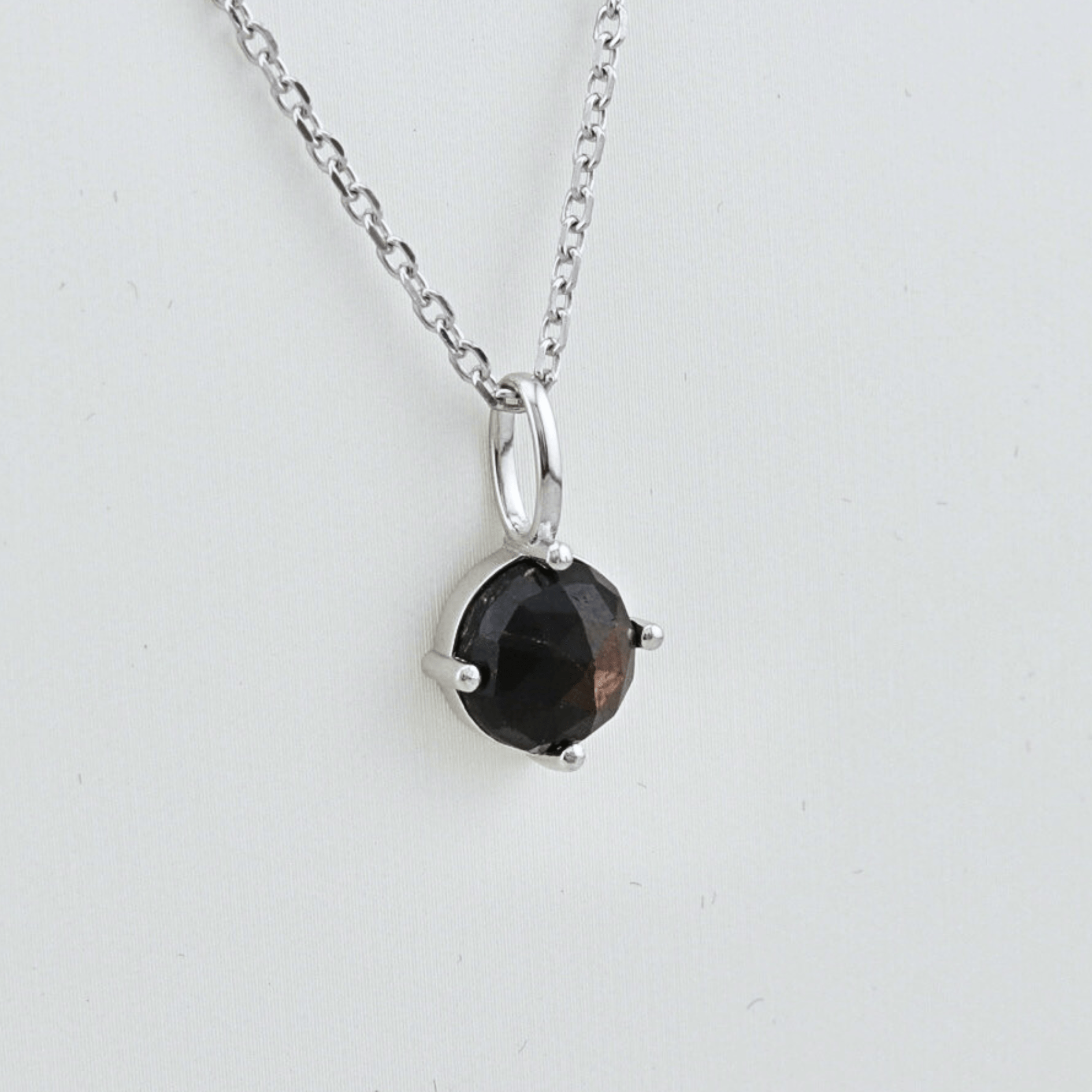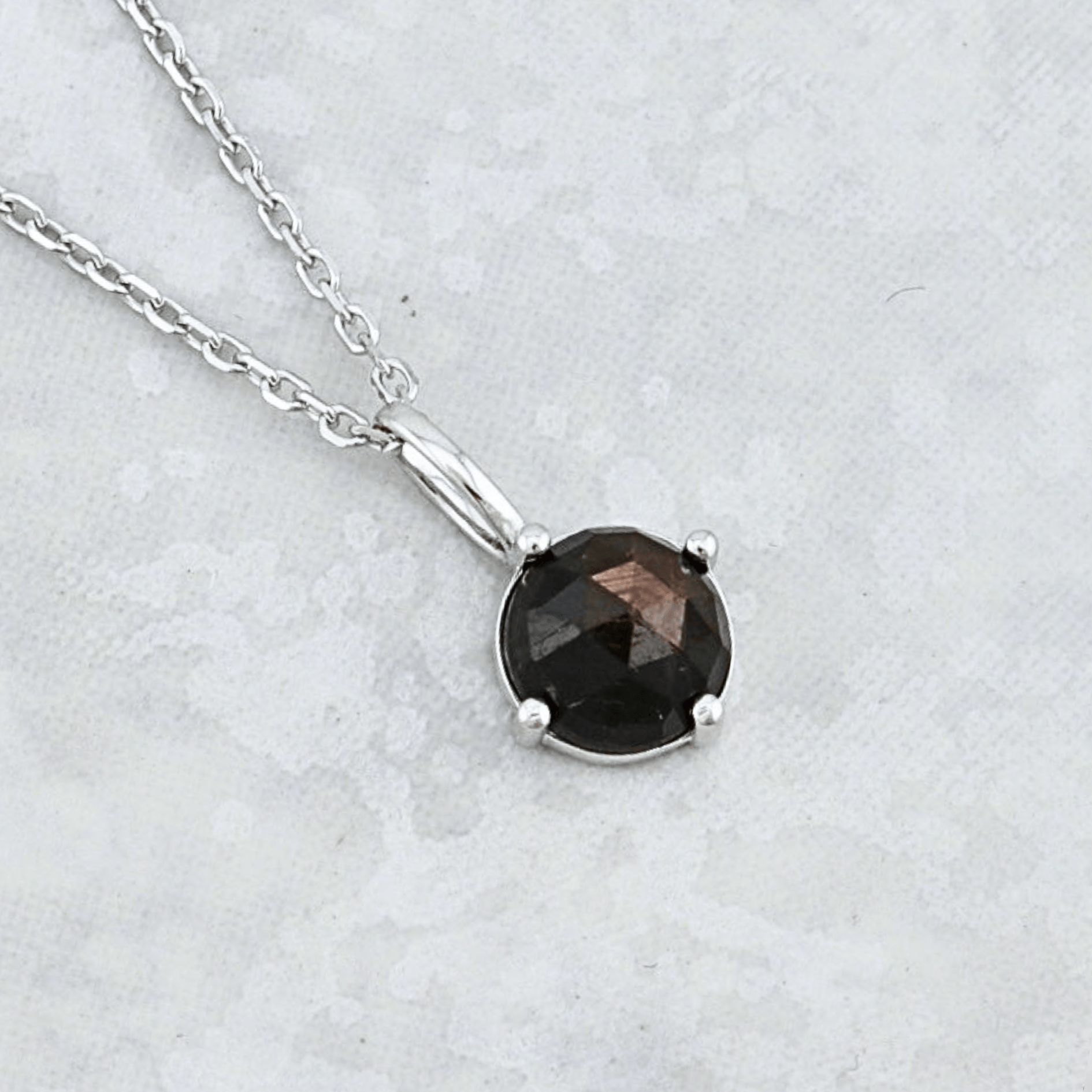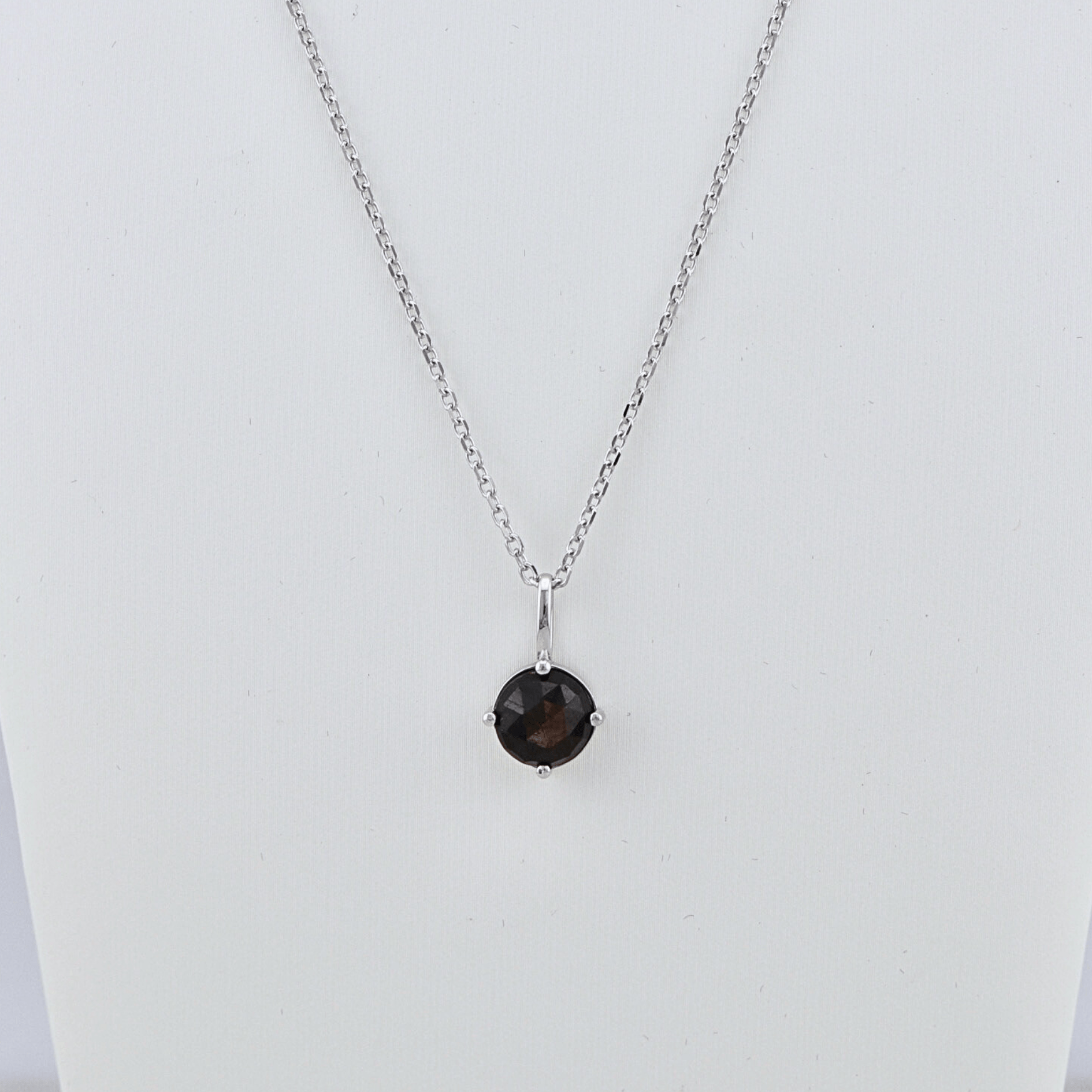 Ce collier minimaliste présente un saphir doré rond à dos plat. La pierre, aux teintes brun-noir et aux reflets dorés, crée un effet subtil de brillance. Le pendentif, discret et épuré, est monté sur une chaîne de 18 pouces, pour un look simple et intemporel.