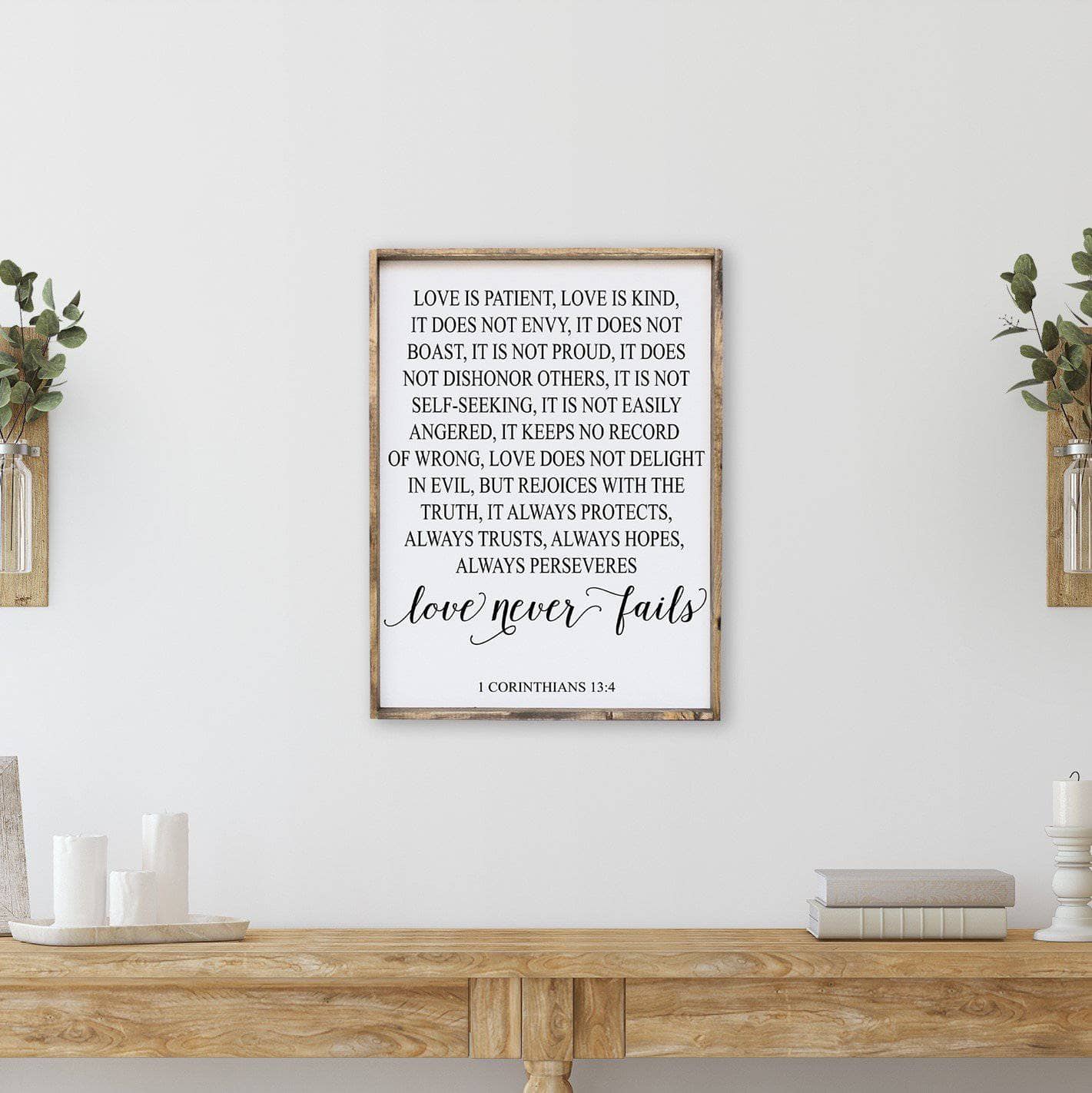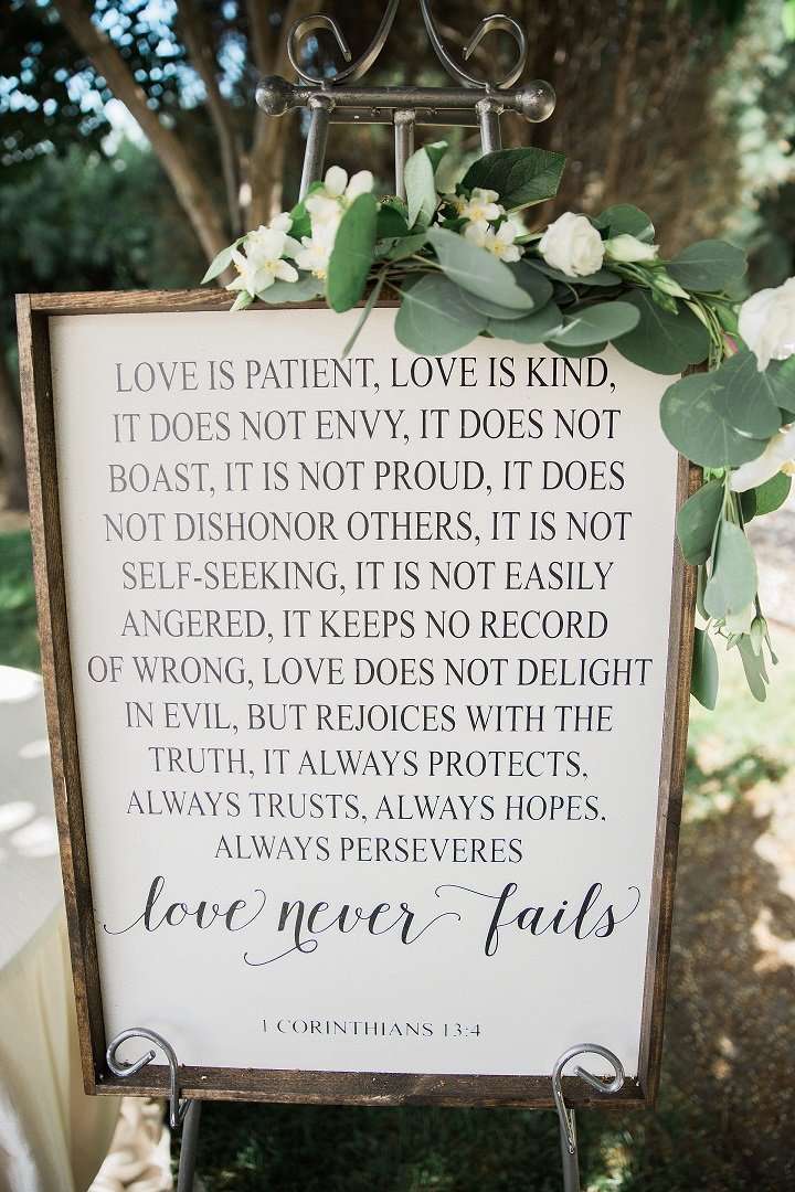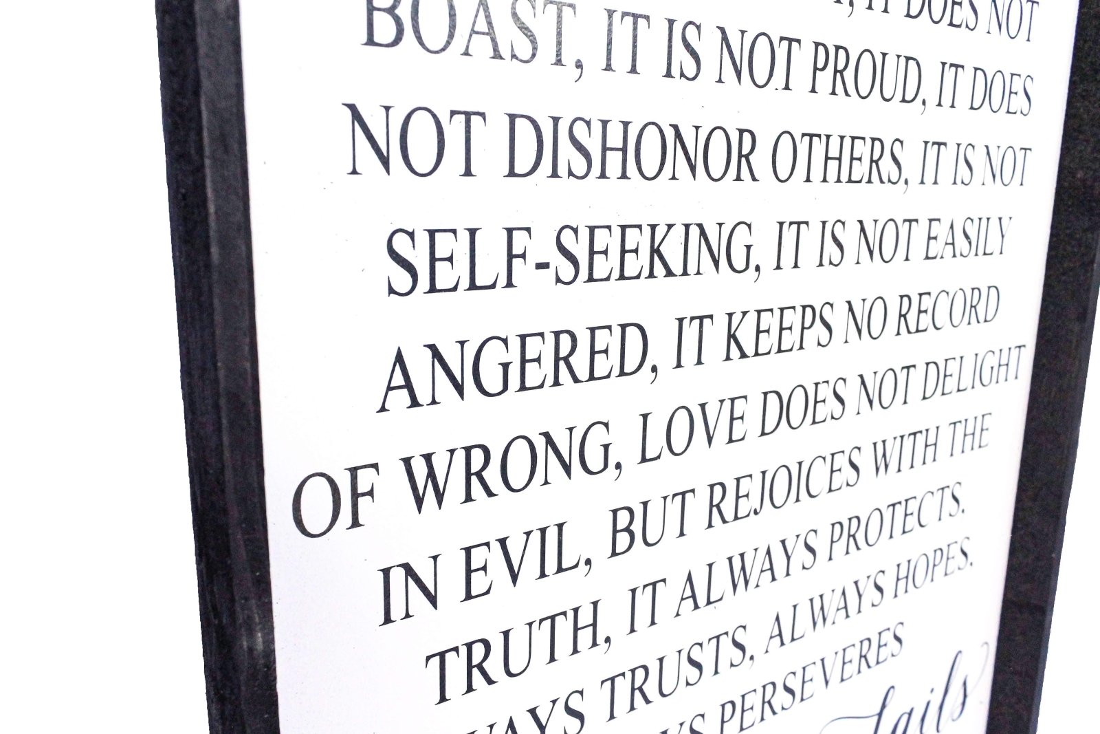 'love is patient, love is kind. It does not envy, it does not boast, it is not proud. It does not dishonor others, it is not self-seeking, it is not easily angered, it keeps no record of wrongs. Love does not delight in evil but rejoices with the truth. It always protects, always trusts, always hopes, always perseveres. Love never fails'