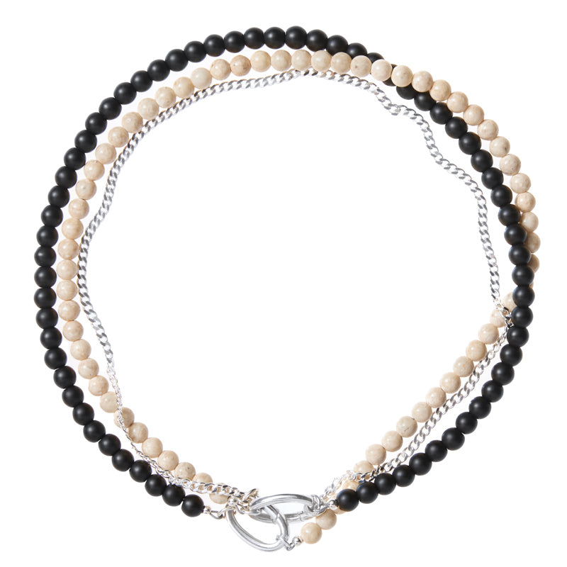 The smooth black matte layer is made with Obsidian beads, believed to provide protection from negativity. The creamy layer includes smooth, round Riverstone beads, believed to accelerate change when your energy is clogged. The third layer features our Thick Curb Chain made in sterling silver with a shiny finish; a stunning contrast that offers shine, depth and gorgeous personality.