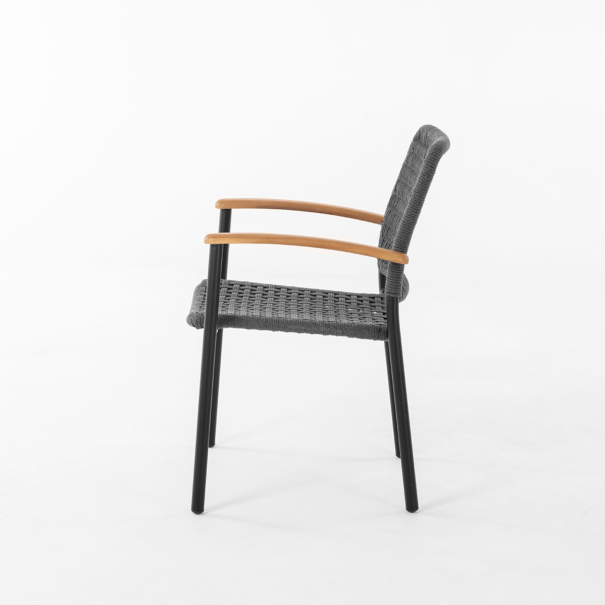 Constructed with a marine-grade aluminum frame, powder-coated in sleek black for durability and style, the Himmel Dining Chair is built to withstand the elements with ease. The premium teak wood armrests not only add a touch of natural elegance but also provide sturdy support for comfortable dining experiences.