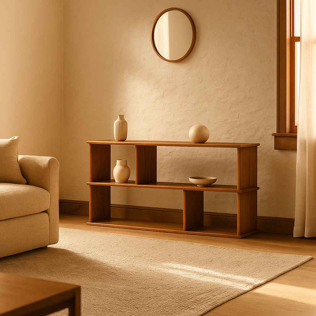 A low horizontal bookshelf in solid red oak, built by hand in Vancouver, BC