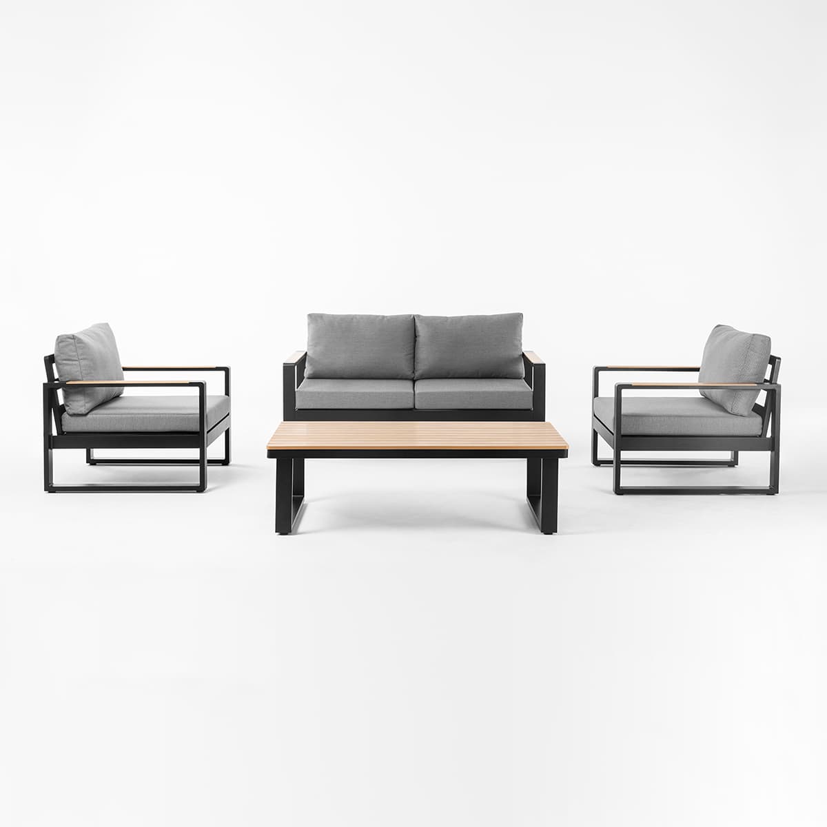 The Imera 4-person conversation set comprises two Armchairs, a Loveseat, and a matching Coffee Table, perfect for elevating your outdoor space to new heights of elegance and comfort.
