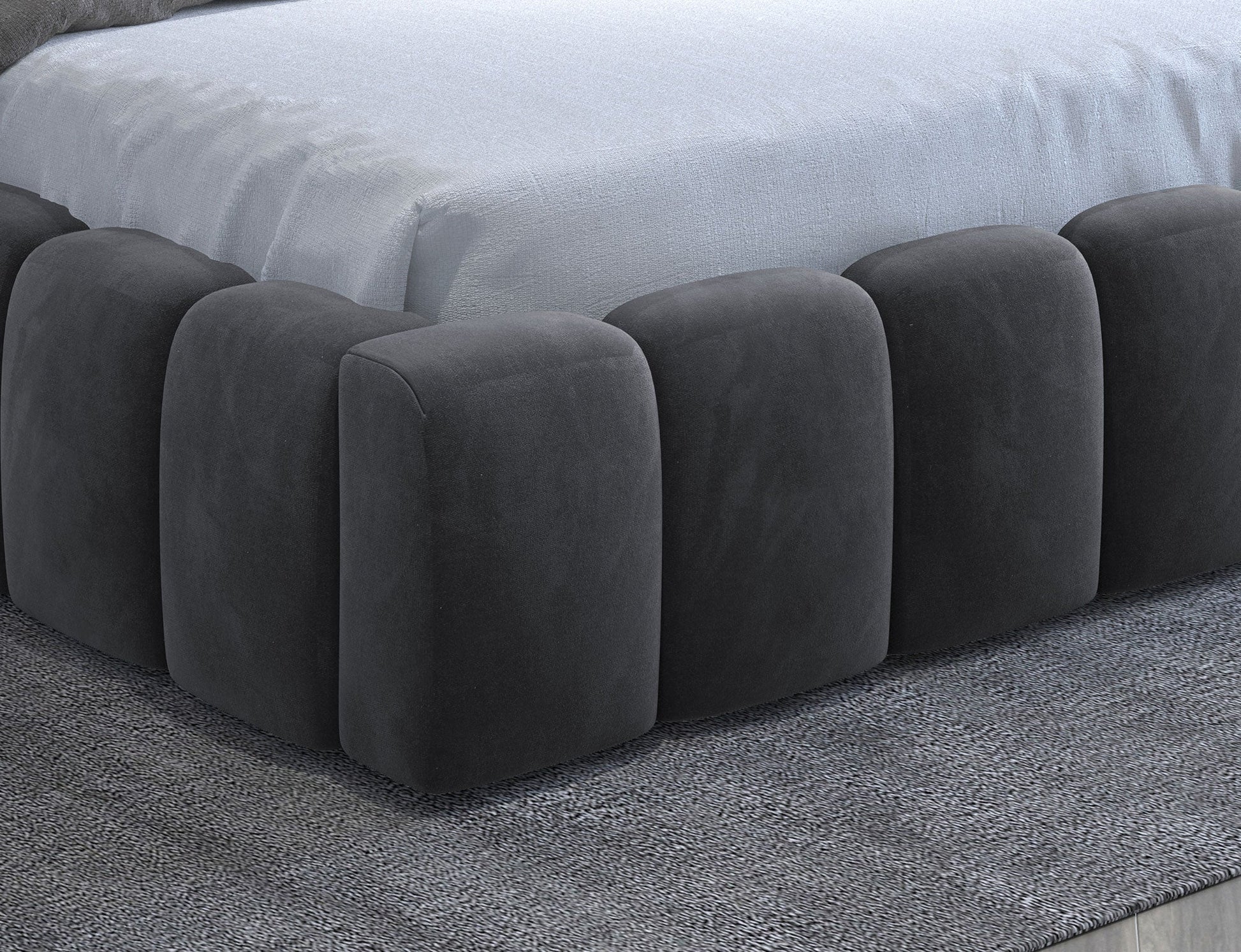 • Features: Wooden/ Metal Frame Bed. Headboard, Footboard, Side Rails are fully upholstered with rich velvet upholstery.