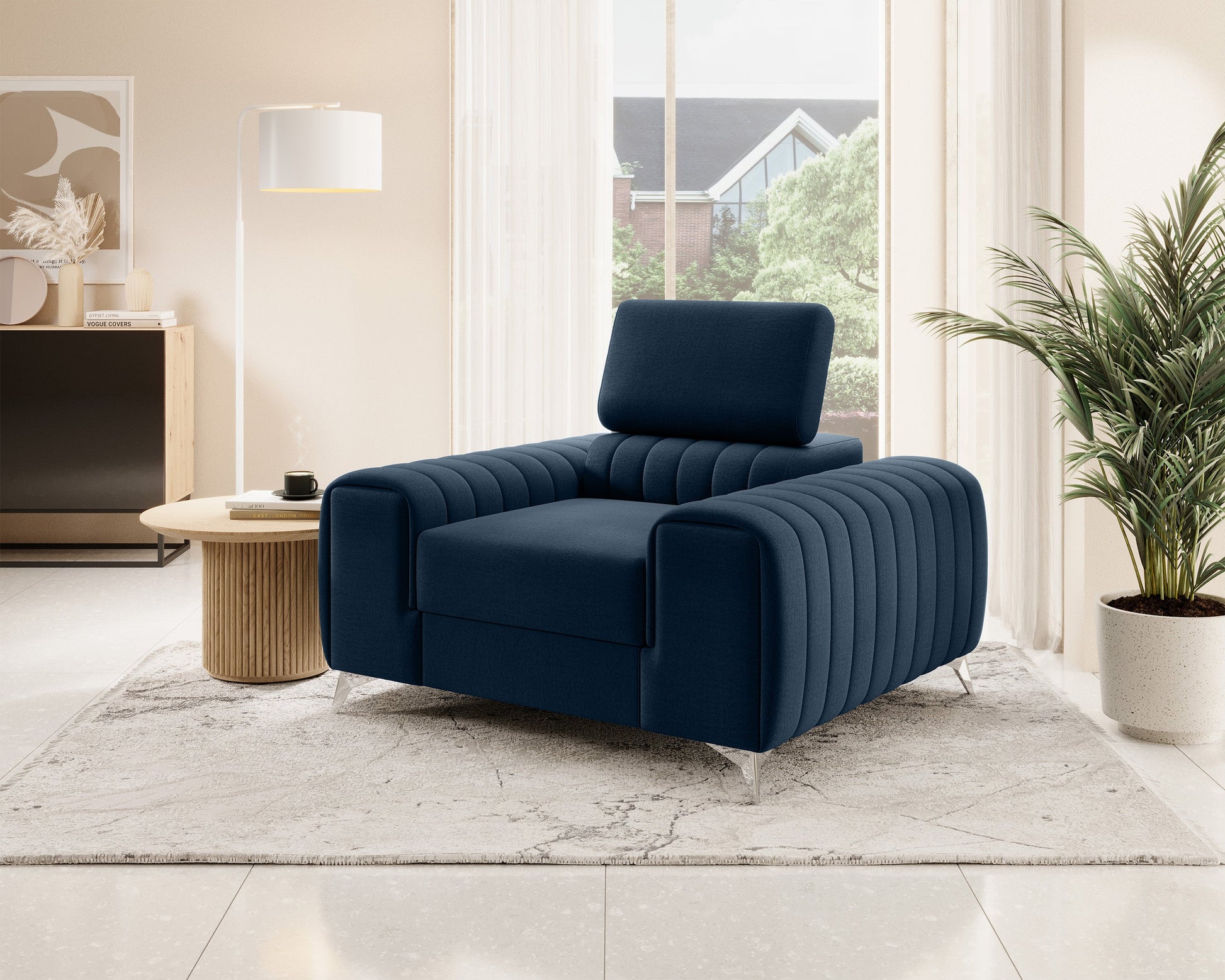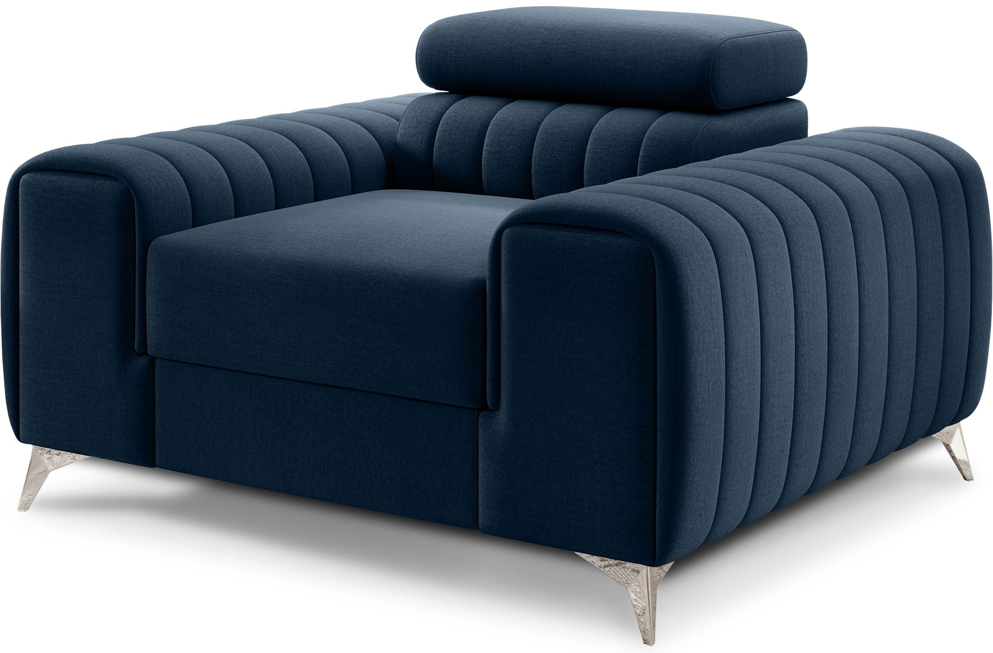 The Laurence armchair has been designed for users of different heights, which is why the backrest height is adjustable within the range of 30 to 45 cm. This allows for customization according to personal preferences and provides optimal spinal support. Equipped with an adjustable headrest, it allows for tailored neck and head support, providing additional comfort during relaxation. The sturdy legs made of chrome-plated steel, with a height of 9 cm, not only add elegance to the armchair but also ensure stability and durability.