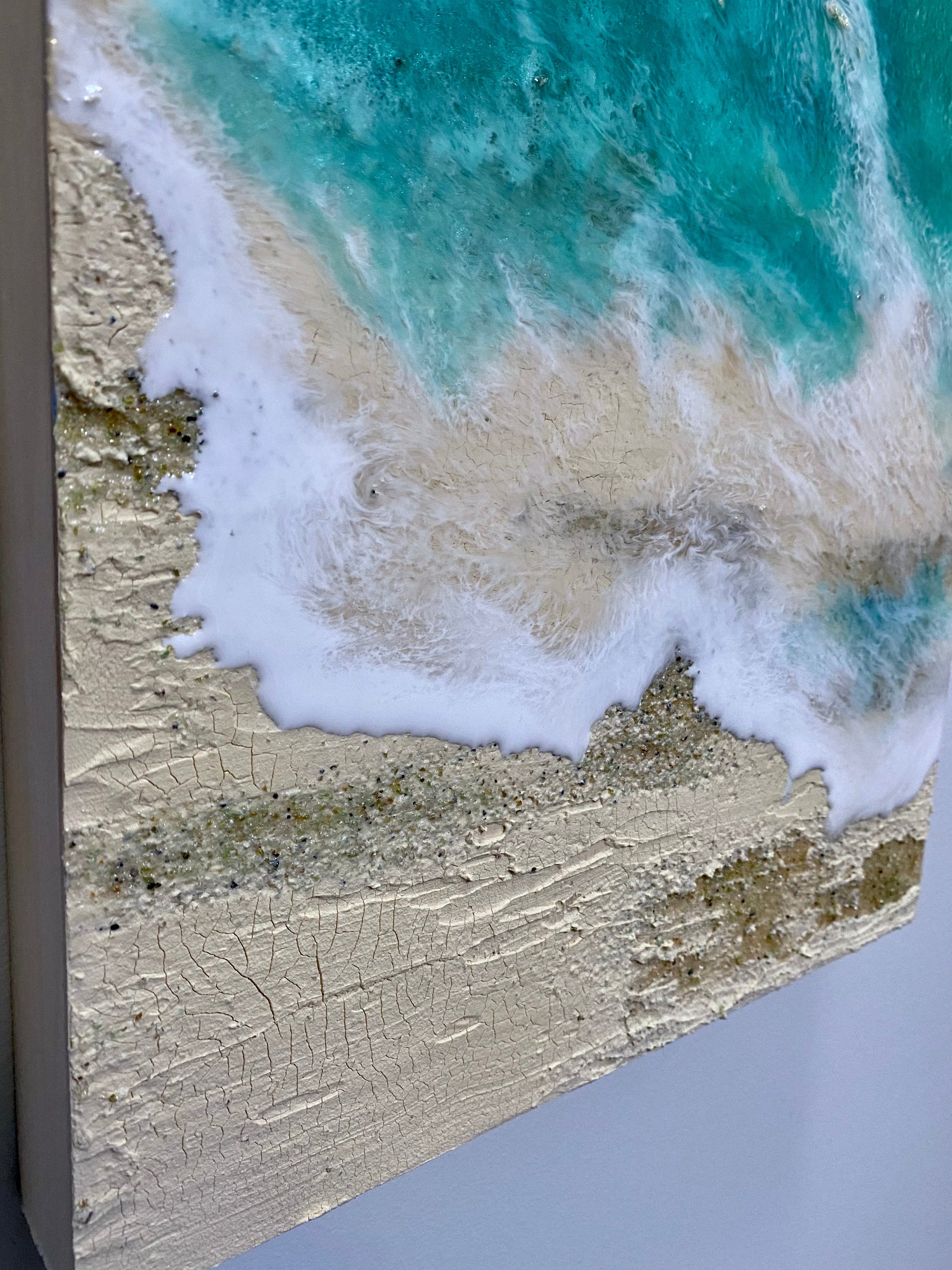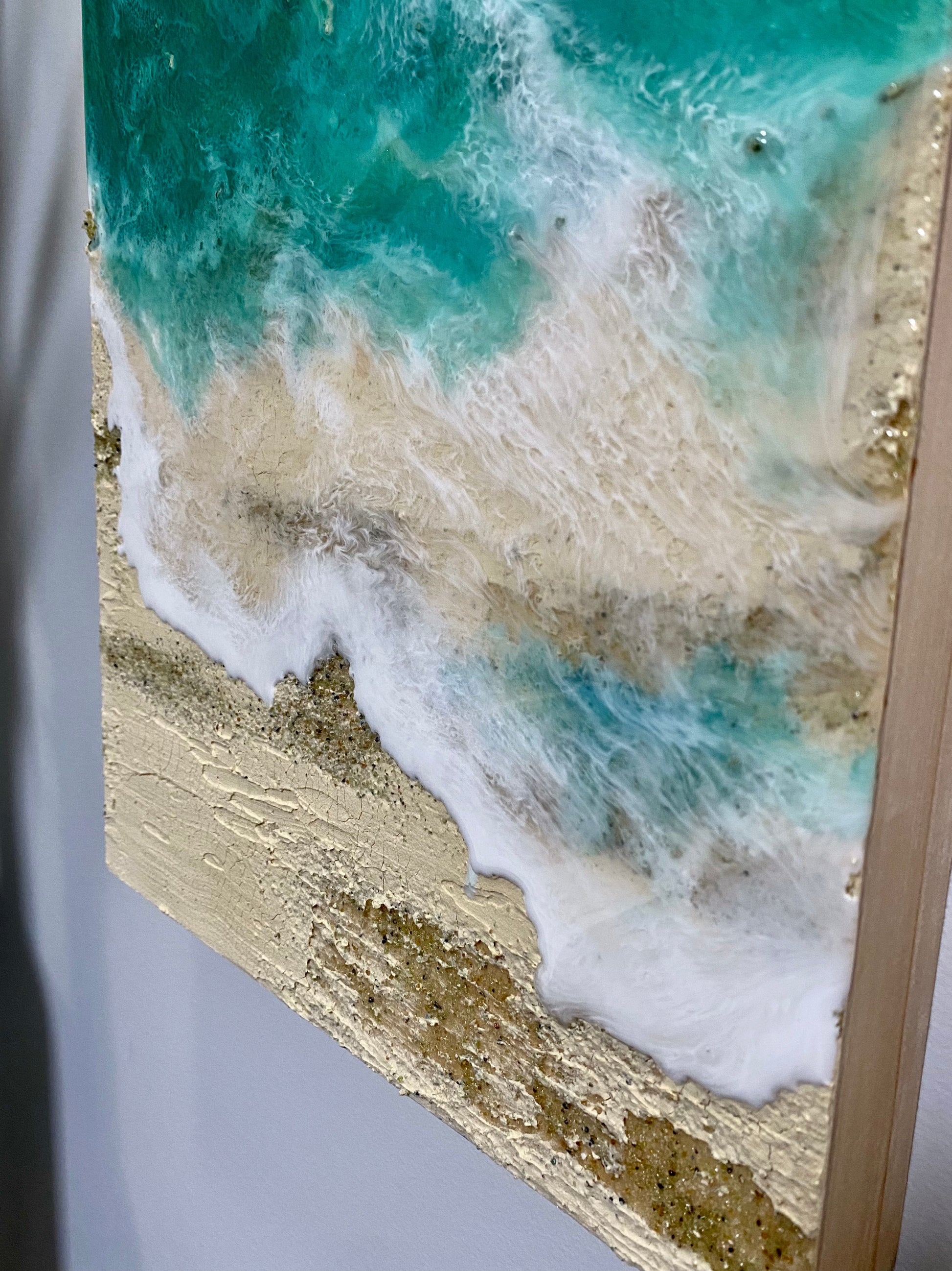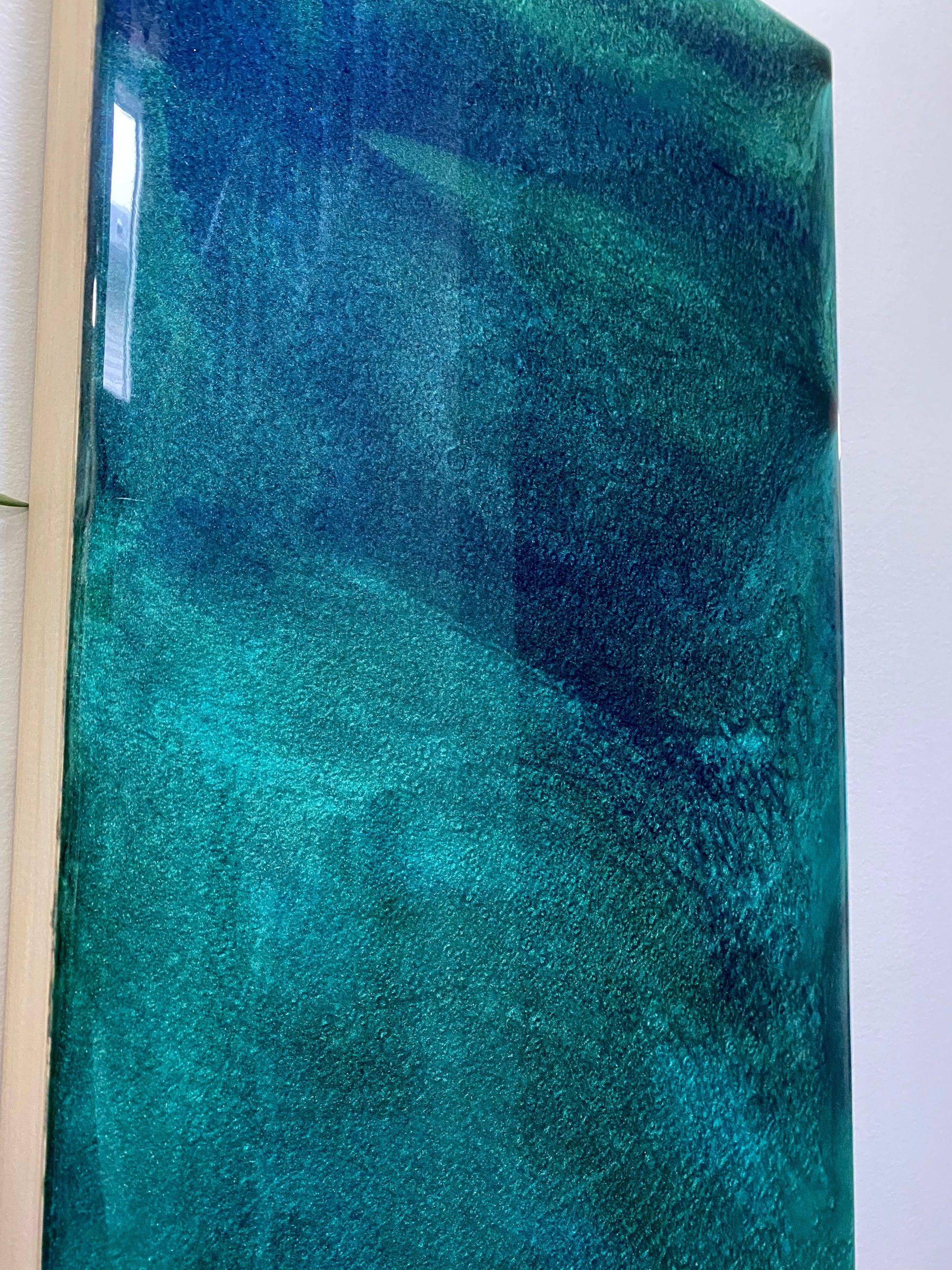 Experience the tranquil beauty of Long Beach with this resin artwork. Featuring a stunning combination of teal, green, and emerald, this piece is accented with crushed walnut and recycled glass to capture the essence of ocean waves lapping against the shore.