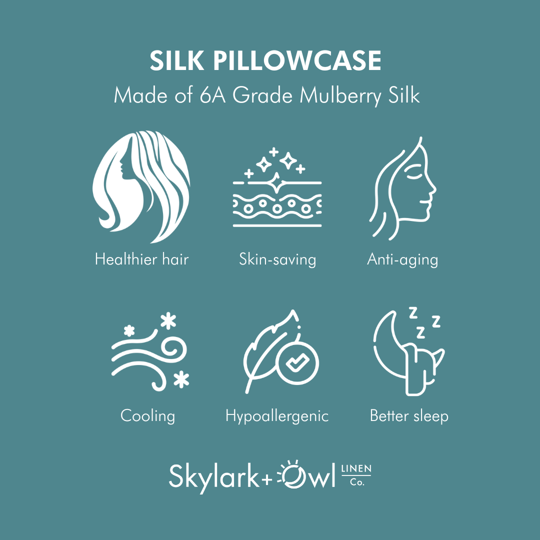 Experience the ultimate in sleep indulgence with Skylark+Owl’s Mulberry Silk Pillowcase. Crafted from the finest 100% Mulberry silk, it provides a cool, breathable surface that feels unbelievably soft against your skin. Our Silk Pillowcase is a dream for your hair and skin, allowing you to look and feel your best the minute you wake up!