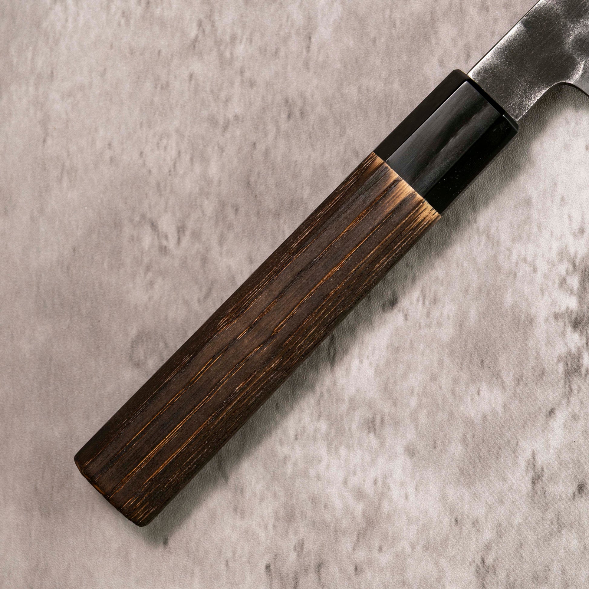 Mutsumi Hinoura-san is the son of legendary blacksmith Tsukasa Hinoura-san and is becoming a bit of a legend in his own right! Having been trained by such a highly skilled smith, Hinoura-sans knives are of incredible quality and performance. He works out of a shop in the Sanjo region and his knives adhere to the styling of many of the other smiths that work in this area. They are a bit thick at the spine where handle and tang come together but gradually get paper thin behind the edge. This blade geometry provides an incredible cutting feel and also provides what we feel is an incredibly comfortable feel in the hand and means the blades have a bit more weight to them than what might be considered "normal". The balance point on these blades is quite far forward which we find really comfortable as it makes the knife feel more like it's pulling itself through ingredients.