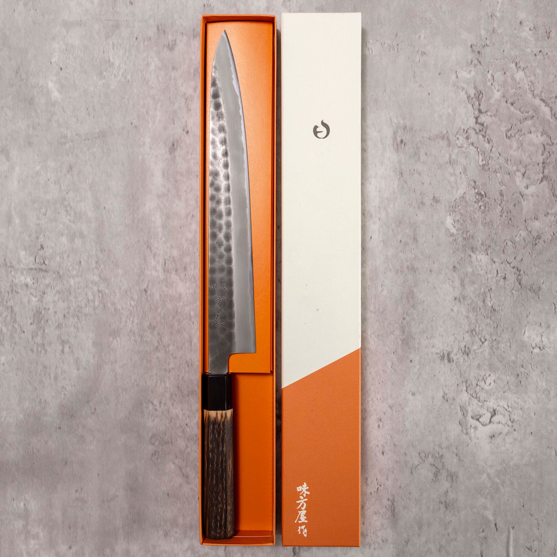 The word "Sujihiki" translates to "flesh slicer" and is designed for all things slicing. Raw and cooked meats, Fish and Beef; it can do it all! The long and slender blades makes it easy to use long, drawing strokes which minimizes the need to saw through meats and helps to provide the perfect slice every time.