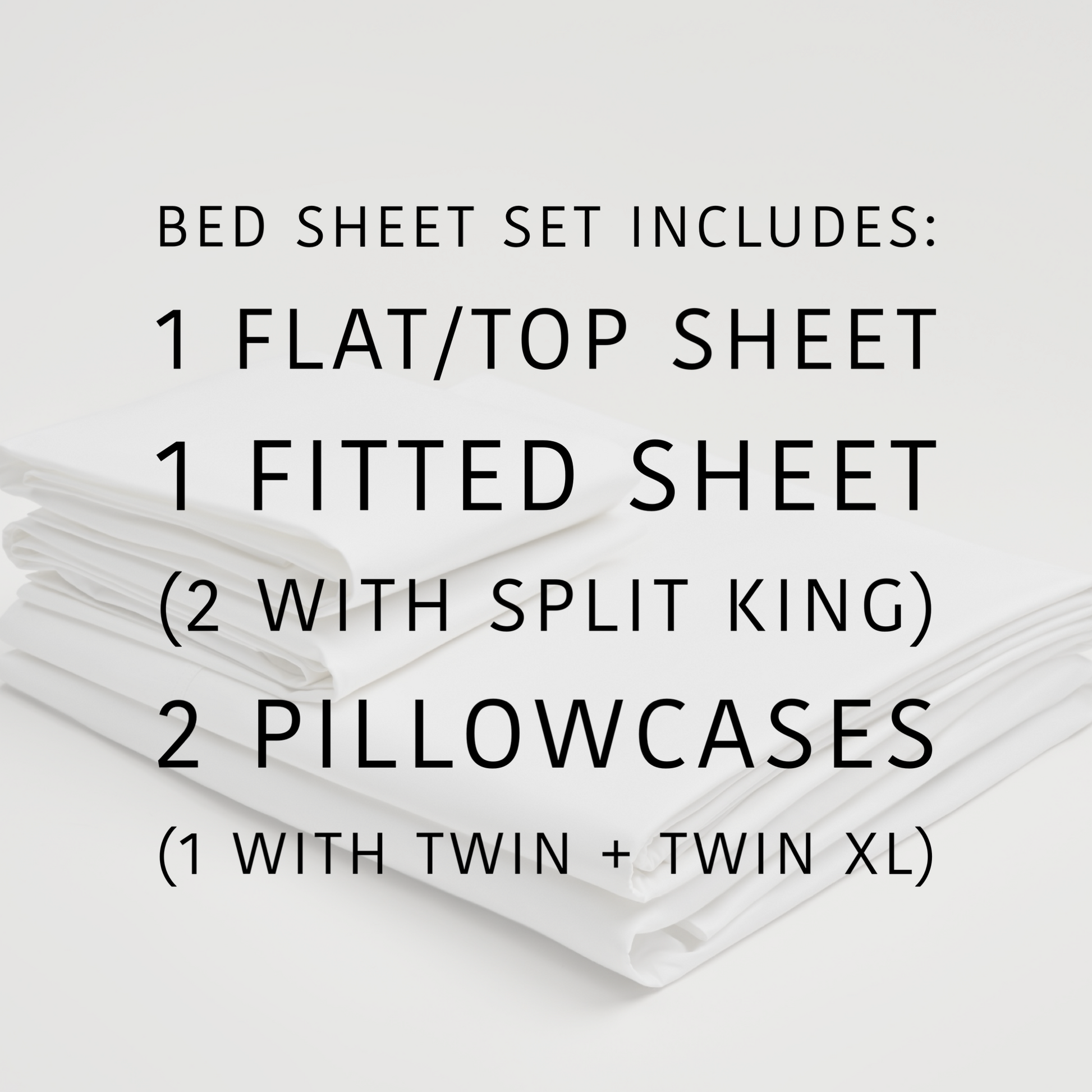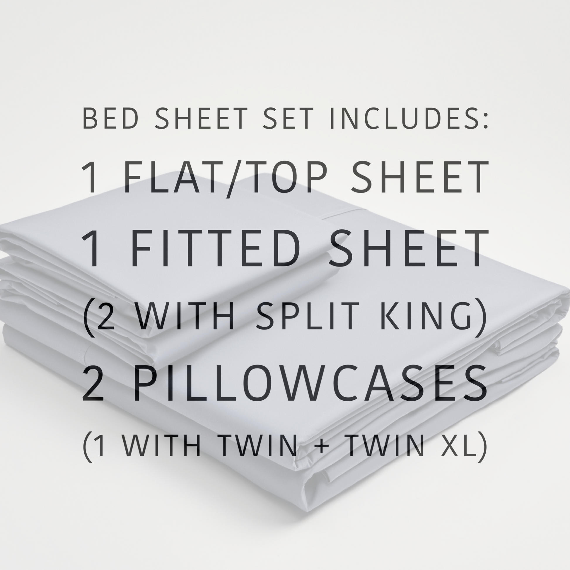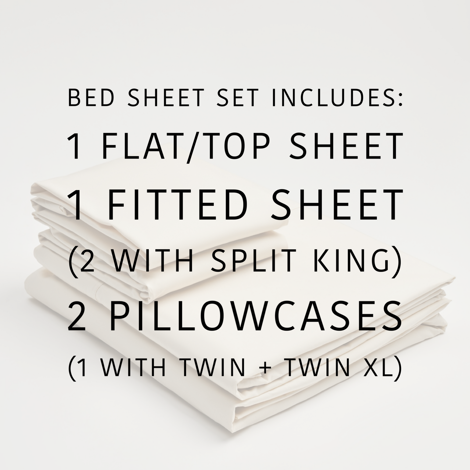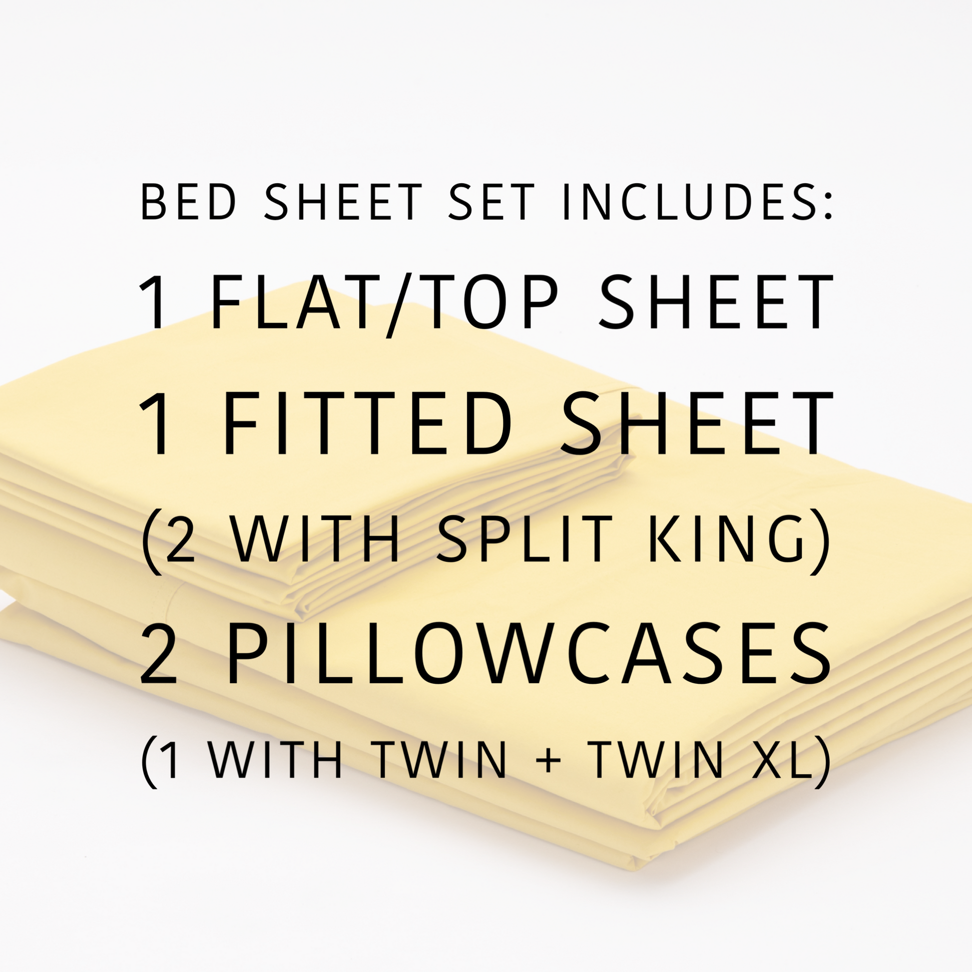 - Bed Sheet Set includes flat sheet, fitted sheet and two pillowcases (one pillowcase with twin set; split king set includes 2 twin xl fitted sheets, 2 king pillowcases and 1 king flat/top sheet).