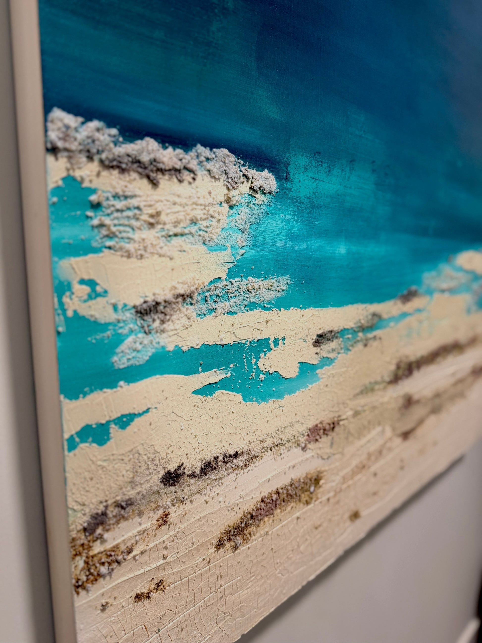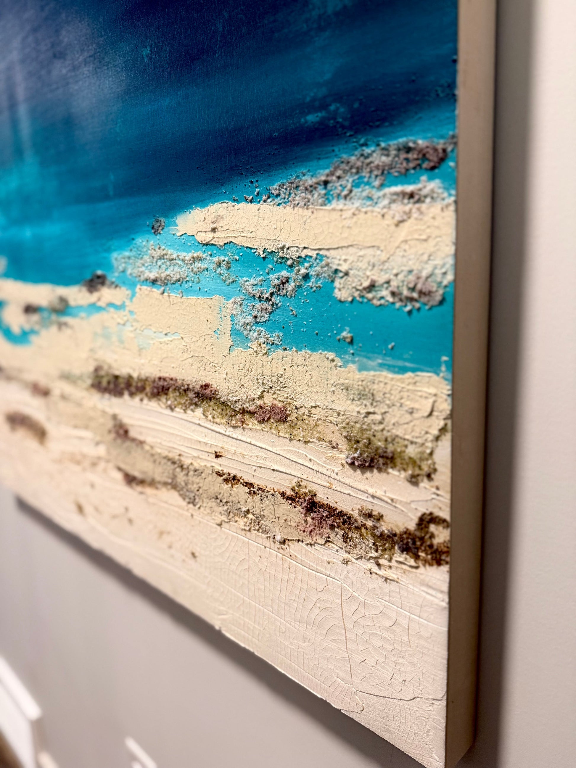 Introducing Pensacola, the elegant birch panel hand painted with acrylic and various mediums. Experience the depth and detail of abstract art with crackle effects, glass beads, and silver and gold leaf. Add a touch of sophistication and exclusivity to your space.