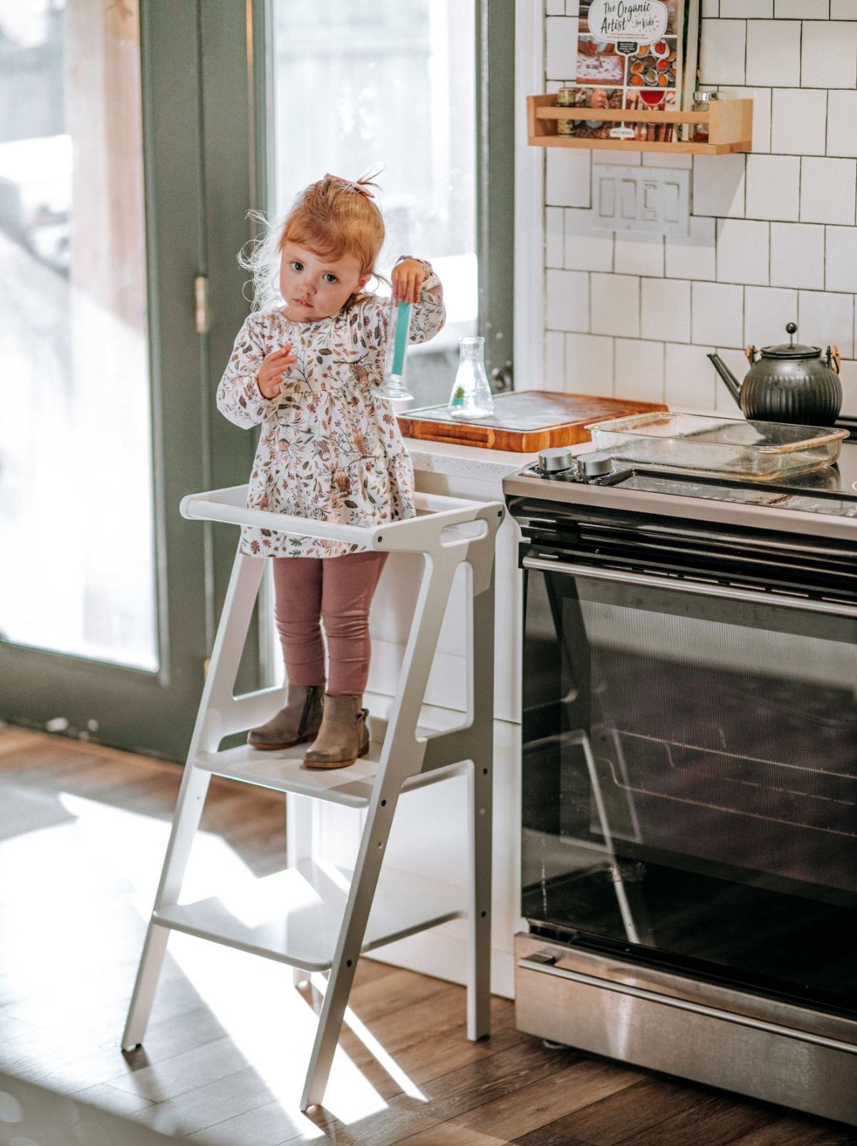 This toddler tower includes a removable rear safety bar, and an adjustable top platform to accommodate children 16 months - 9 years. Our kitchen tower is designed for learning, play, cleaning and cooking with your child. Product Dimensions: 34in high, 15.5in wide, 13in deep.