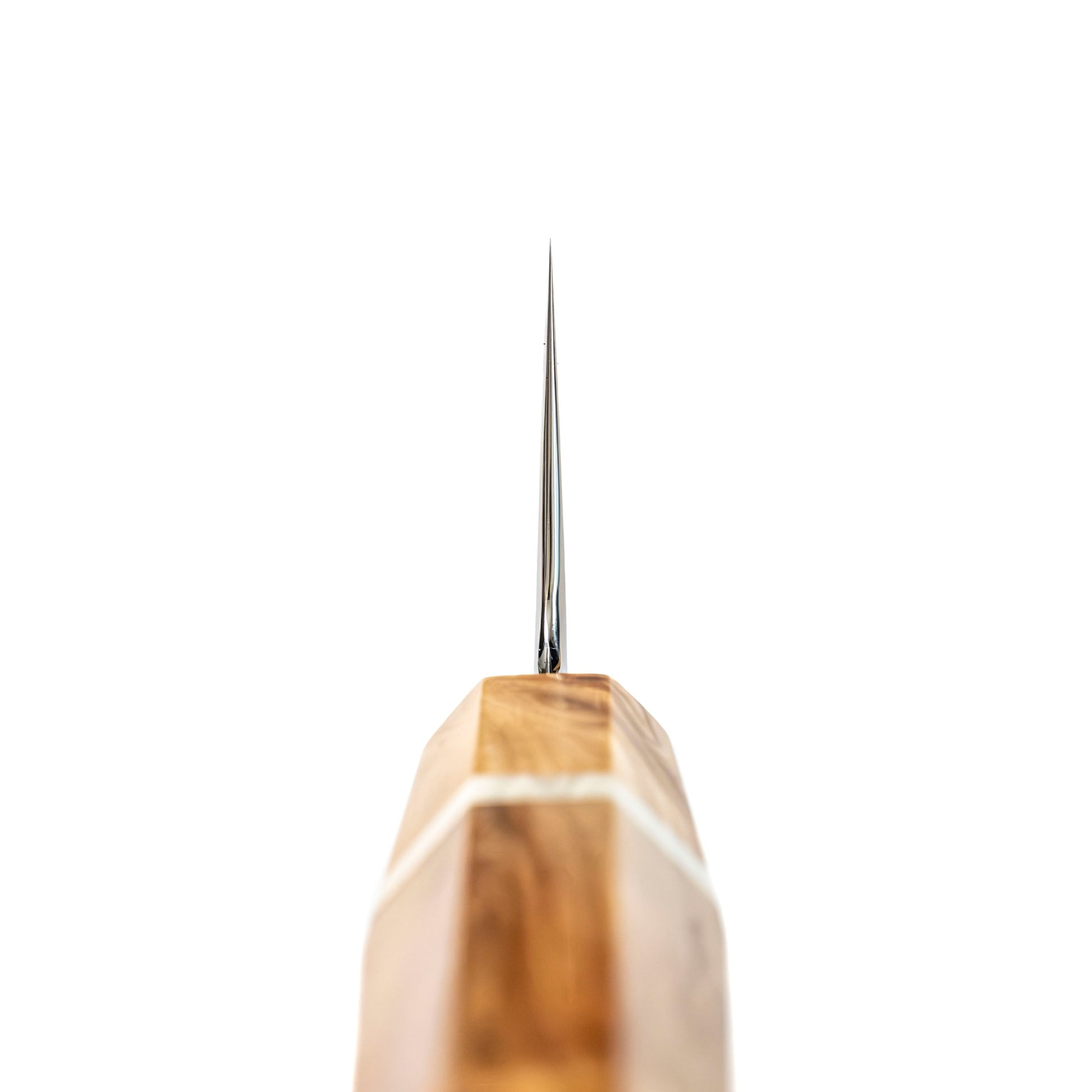 The octagonal Japanese-style handle is made of curly maple, characterized by its natural color tone, providing a gentle texture and grip. Octagonal handles have long been popular not only because the number eight is considered lucky in Japan, but also they are easy to grip.