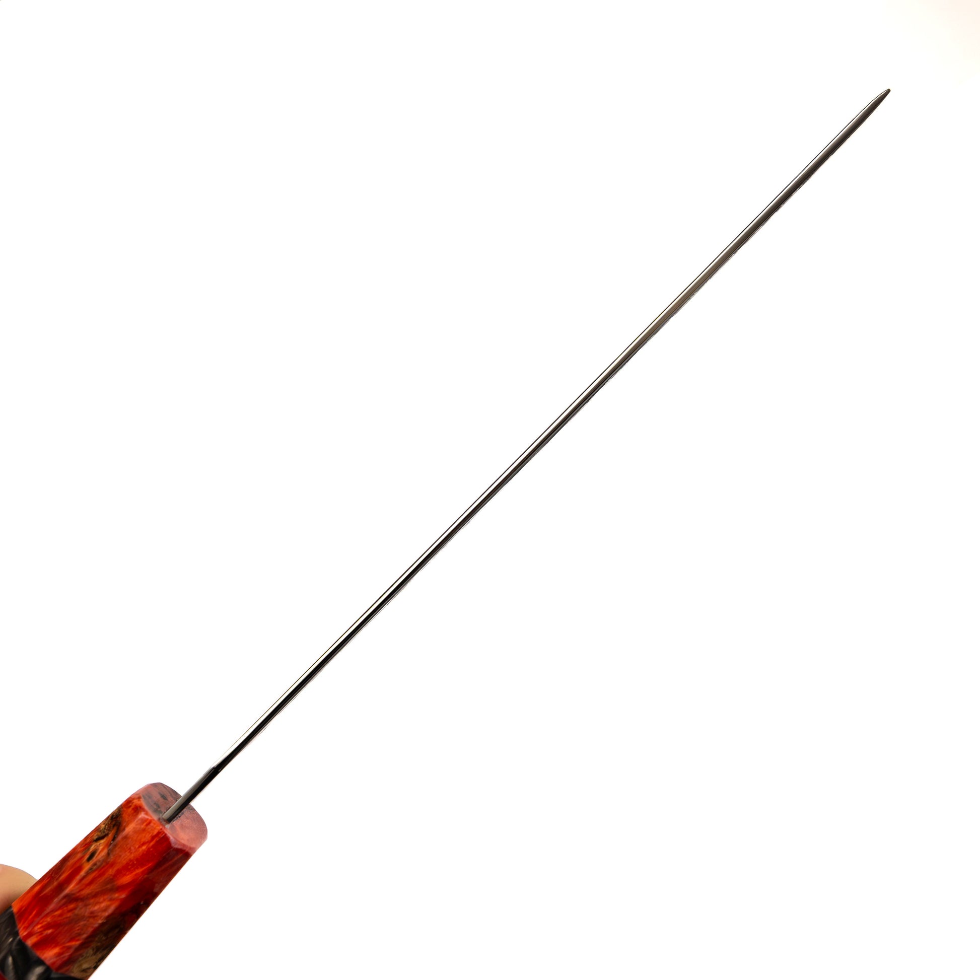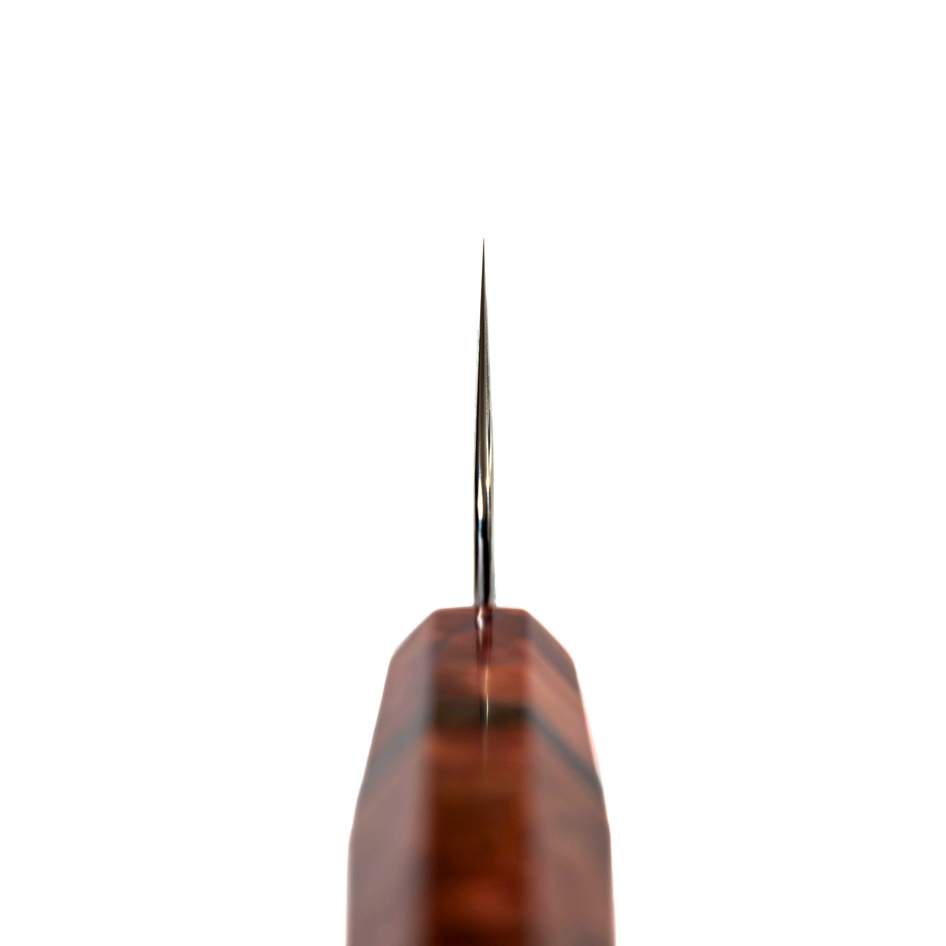 Ryusen Hamono works primarily with SG2/R2, a high powder stainless steel that is very hard and grinds super thin behind the edge. The blades generally have a shorter blade height, which makes them great for precise slicing tasks. Their profiles vary quite a bit, from aggressive sweeping k-tips to more traditional yet modern gyuto shapes. The blades are very consistent, as they employ both modern and traditional techniques, each blade is hand sharpened and impeccably sharp out of the box. Every handle has a unique pattern, particularly the Blazen line, which has a distinctly comfortable taper, compared to the Tanganryu line, which is a hybrid western micarta handle, also with a smooth finish.