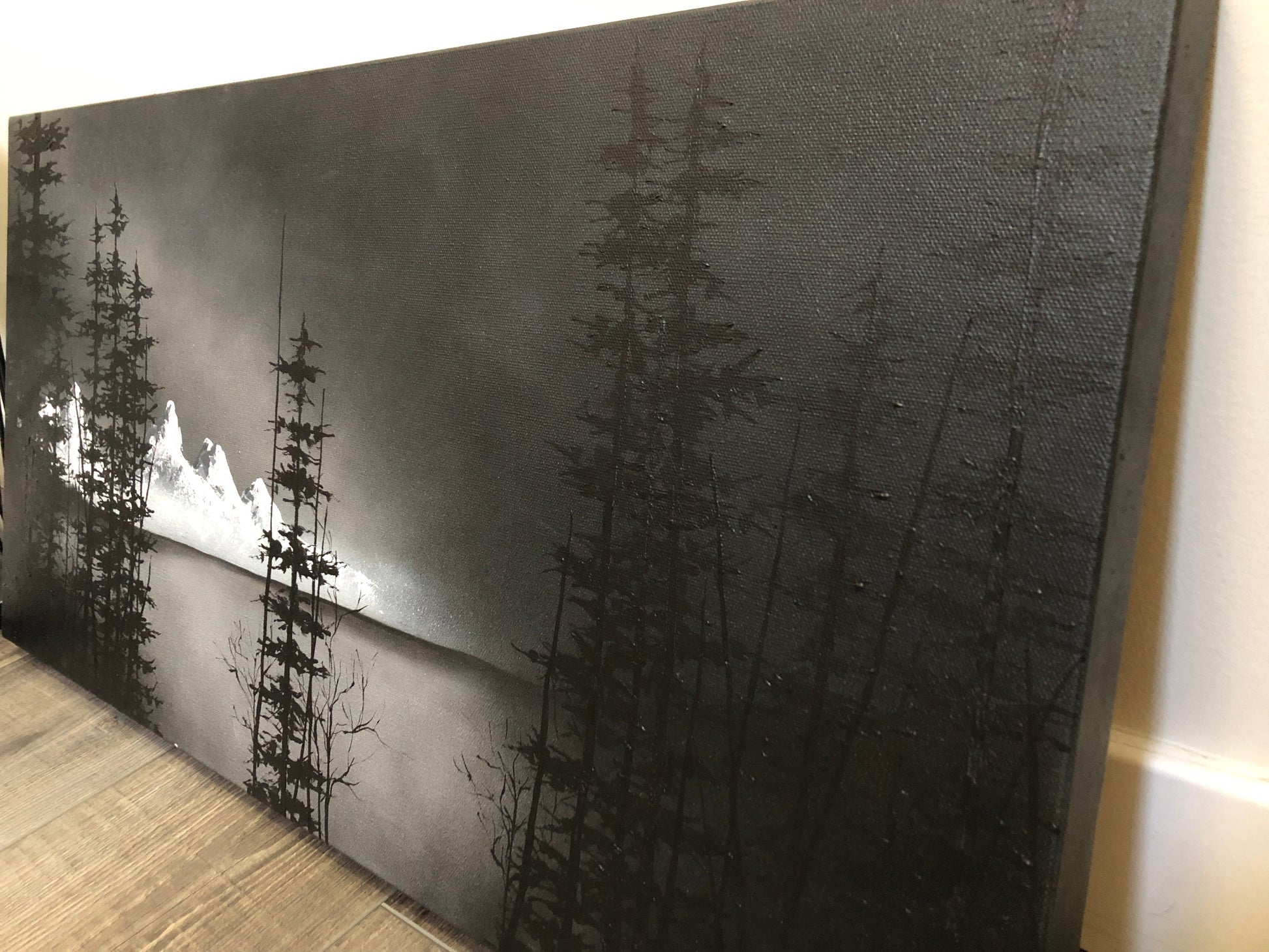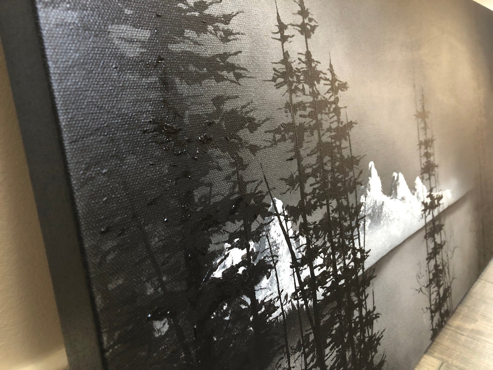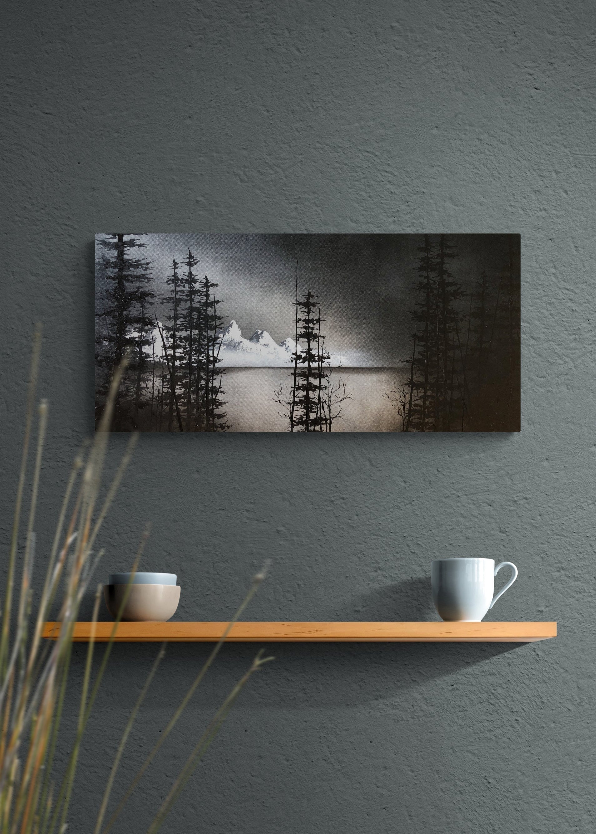 Experience the timeless beauty of nature with this stunning monochromatic black and white landscape painting on a premium gallery canvas, featuring a serene lake and snow-capped mountains against a backdrop of graceful silhouette trees.