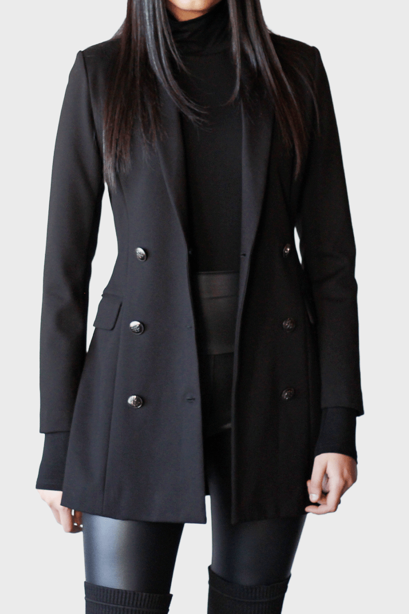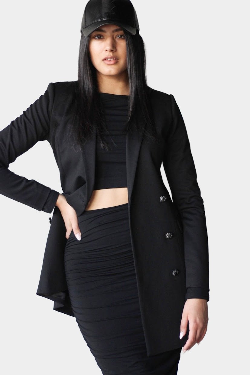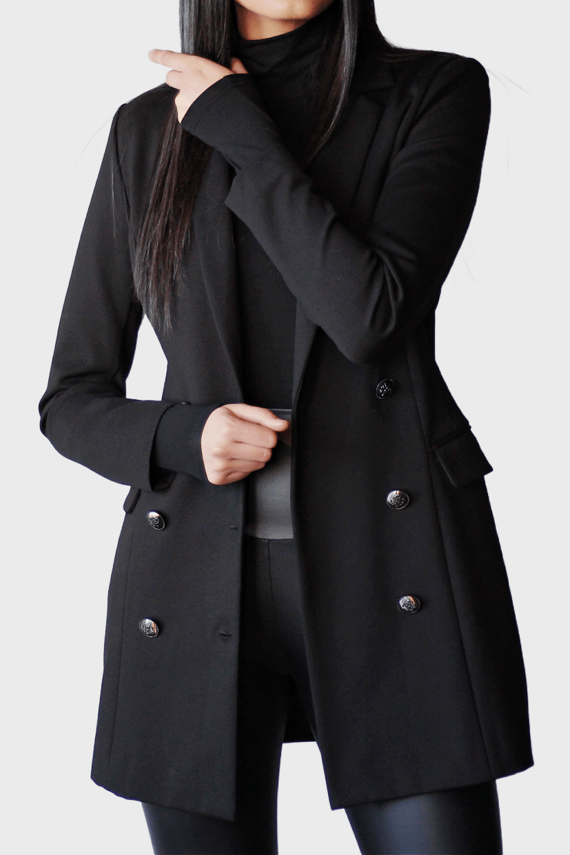 A great blazer starts in the shoulders, so that’s where we began. The Addison is designed to be worn open, with a mid-thigh length and a tailored shape that subtly shifts just above the waist. That intentional break creates the illusion of defined hips, a slimmer torso, and longer legs, no matter your body type.