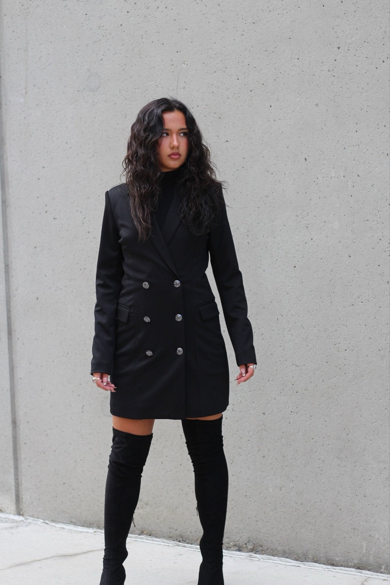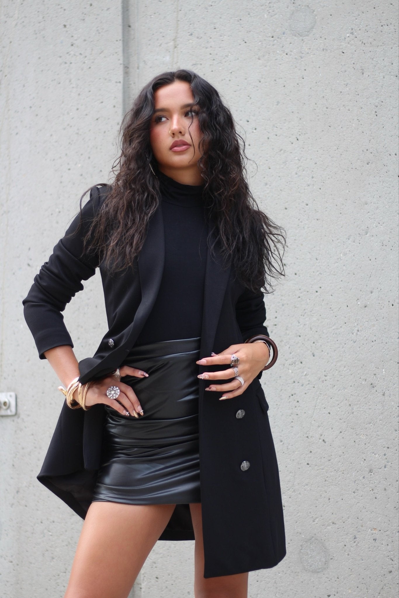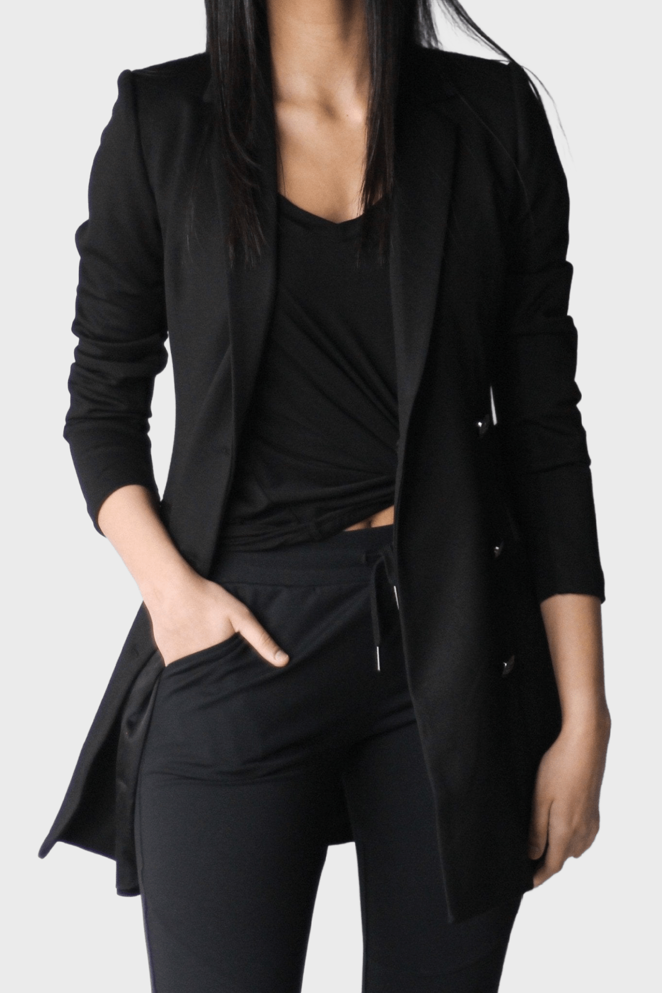 A great blazer starts in the shoulders, so that’s where we began. The Addison is designed to be worn open, with a mid-thigh length and a tailored shape that subtly shifts just above the waist. That intentional break creates the illusion of defined hips, a slimmer torso, and longer legs, no matter your body type.