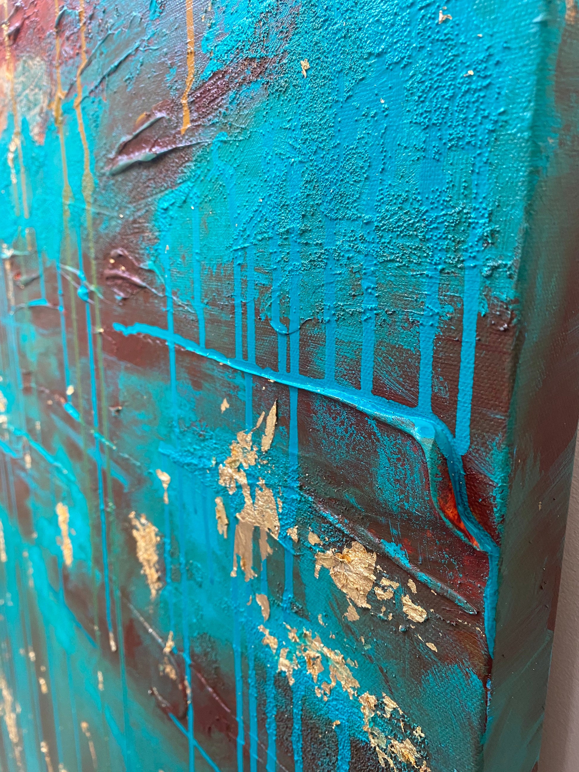 Crackle effects, glass bead and silver and gold leaf contribute to the depth and detail in this abstract painting