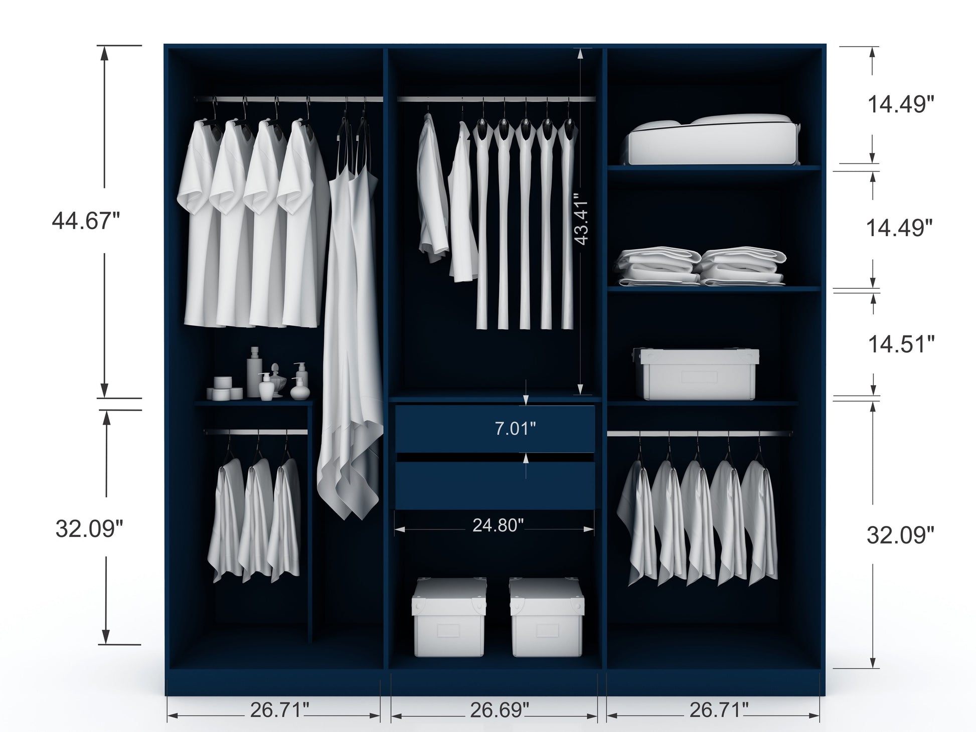 • 3-Sectional Wardrobe Includes 4 Fixed Shelves, 4 Aluminum Hanging Rods, and 2 Center Drawers.