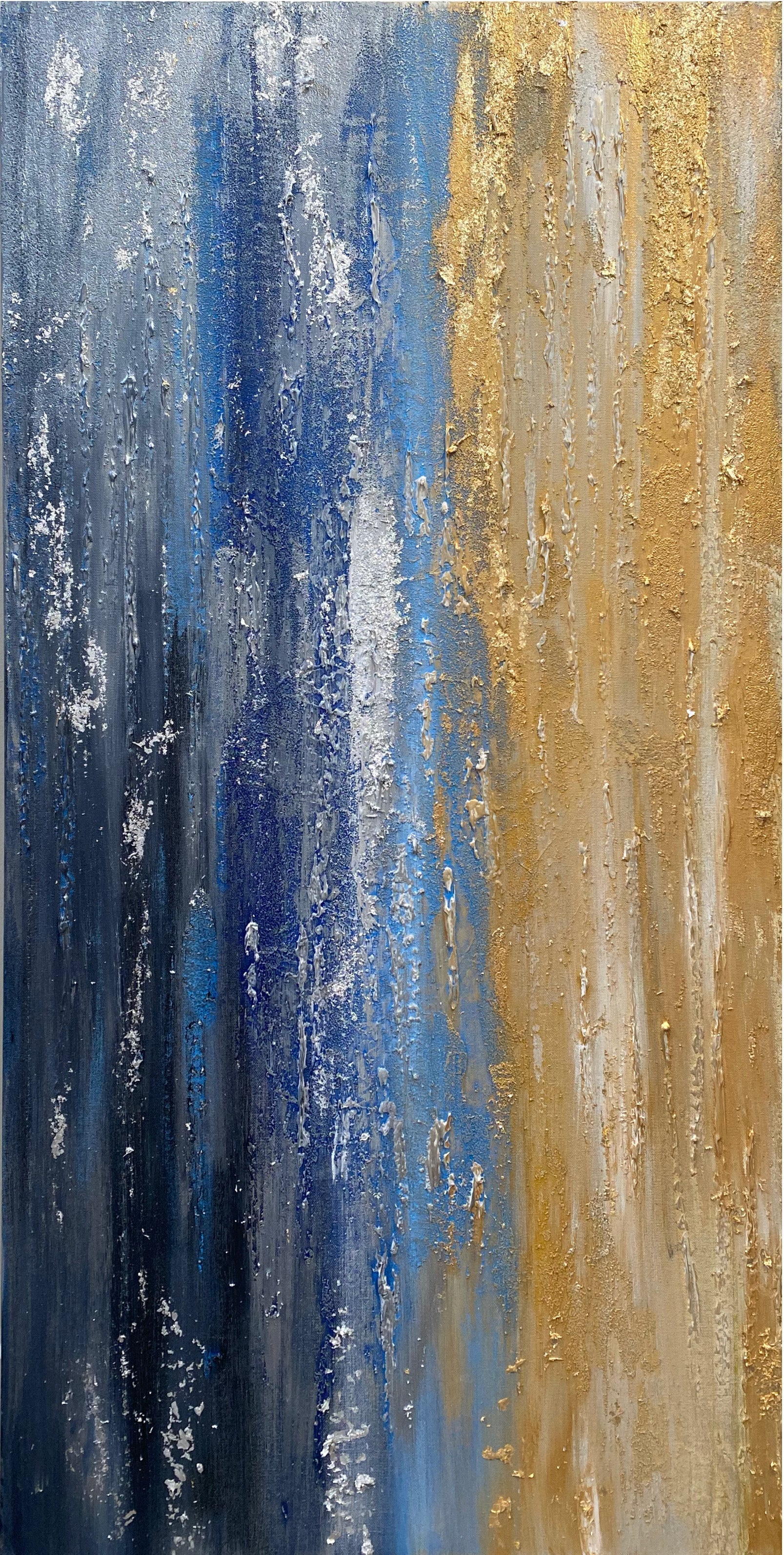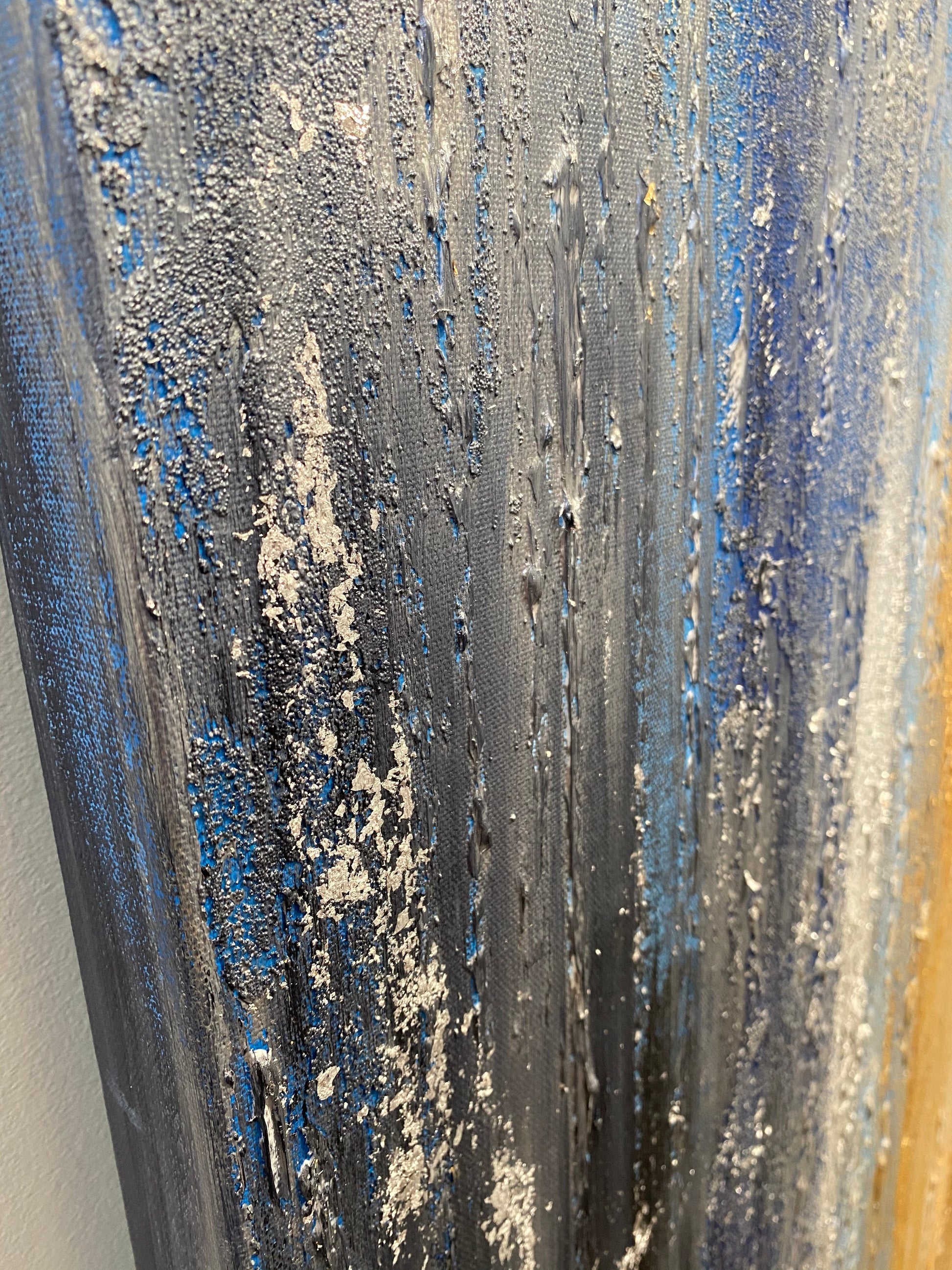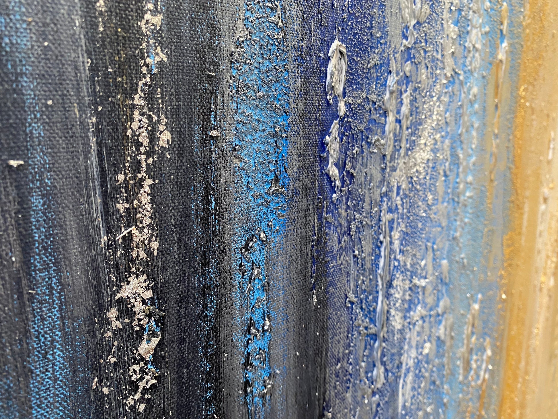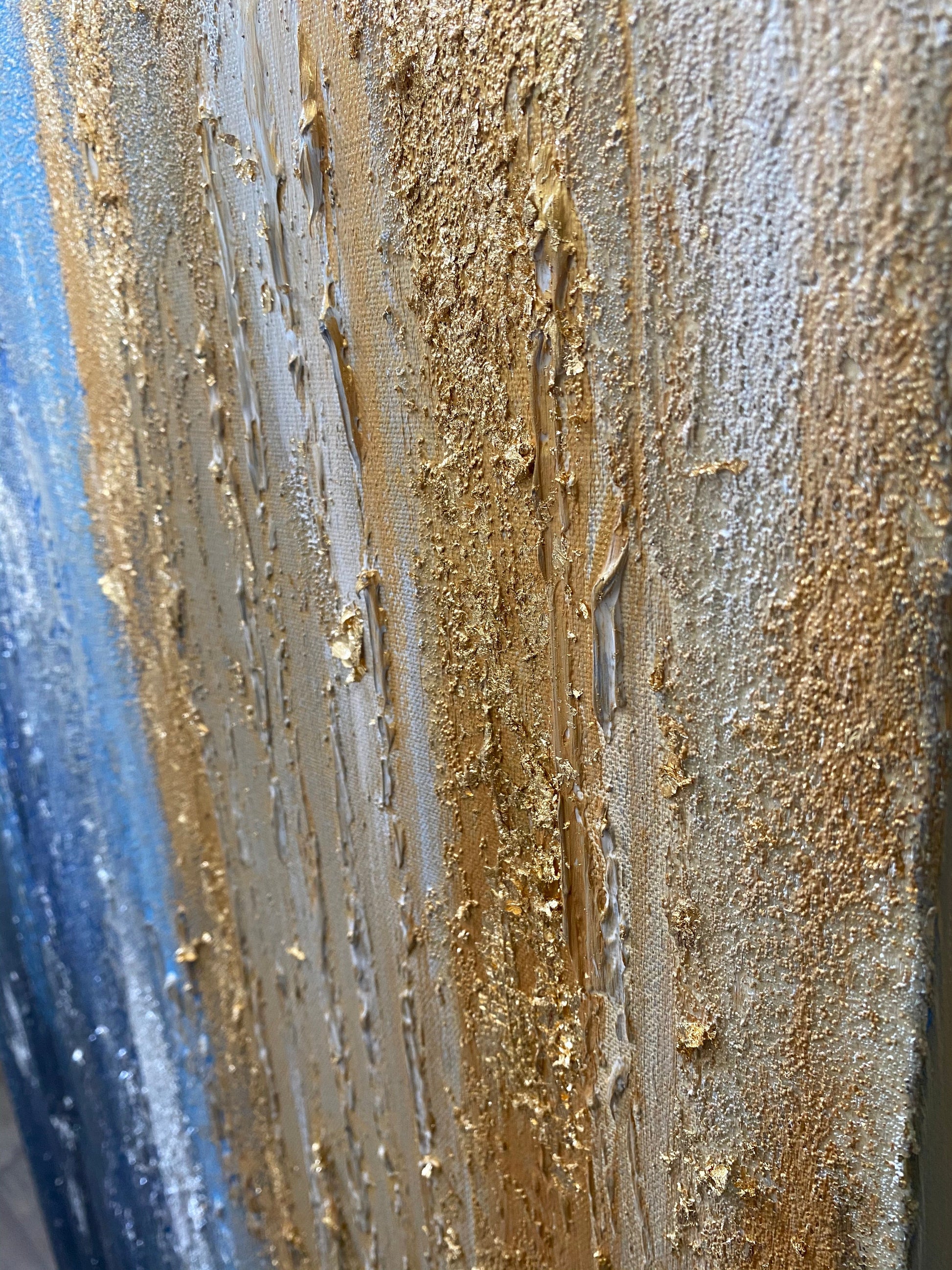 Crackle effects, glass bead and silver and gold leaf contribute to the depth and detail in this abstract painting
