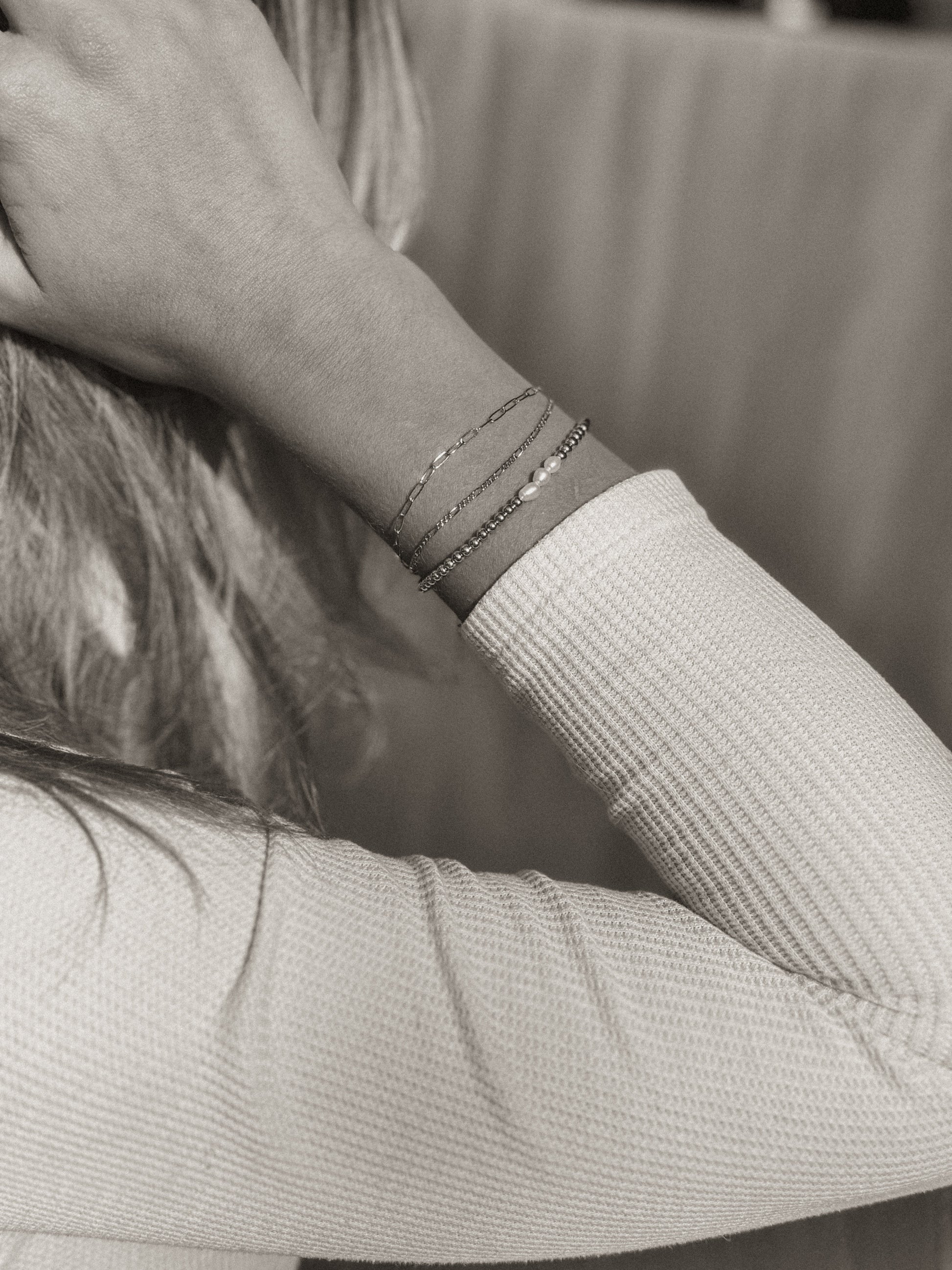 Three-in-One Design: Features a classic figaro chain for timeless style, a modern paperclip chain for contemporary flair, and a 3mm beaded bracelet accented with three genuine freshwater pearls for a touch of elegance.