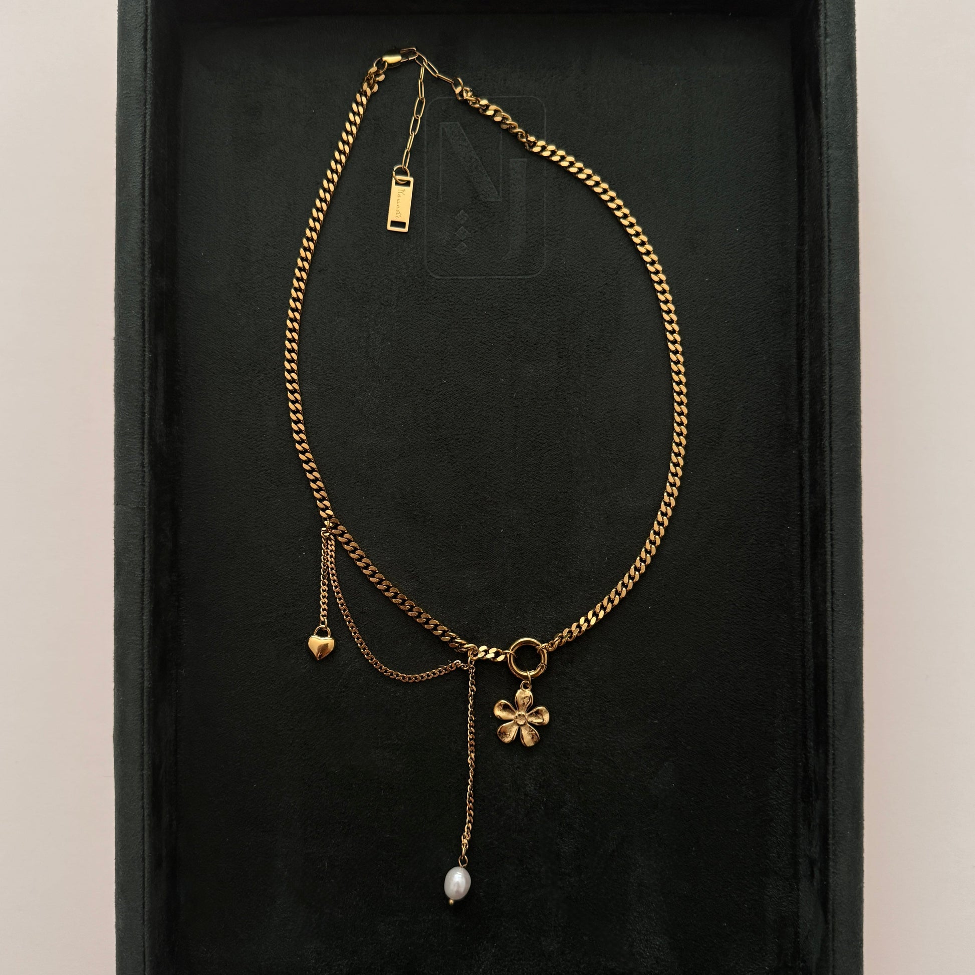 This elegant Willow Necklace showcases a stunning flower pendant, along with a charming heart and pearl charm drop, all delicately placed on a statement curb chain.