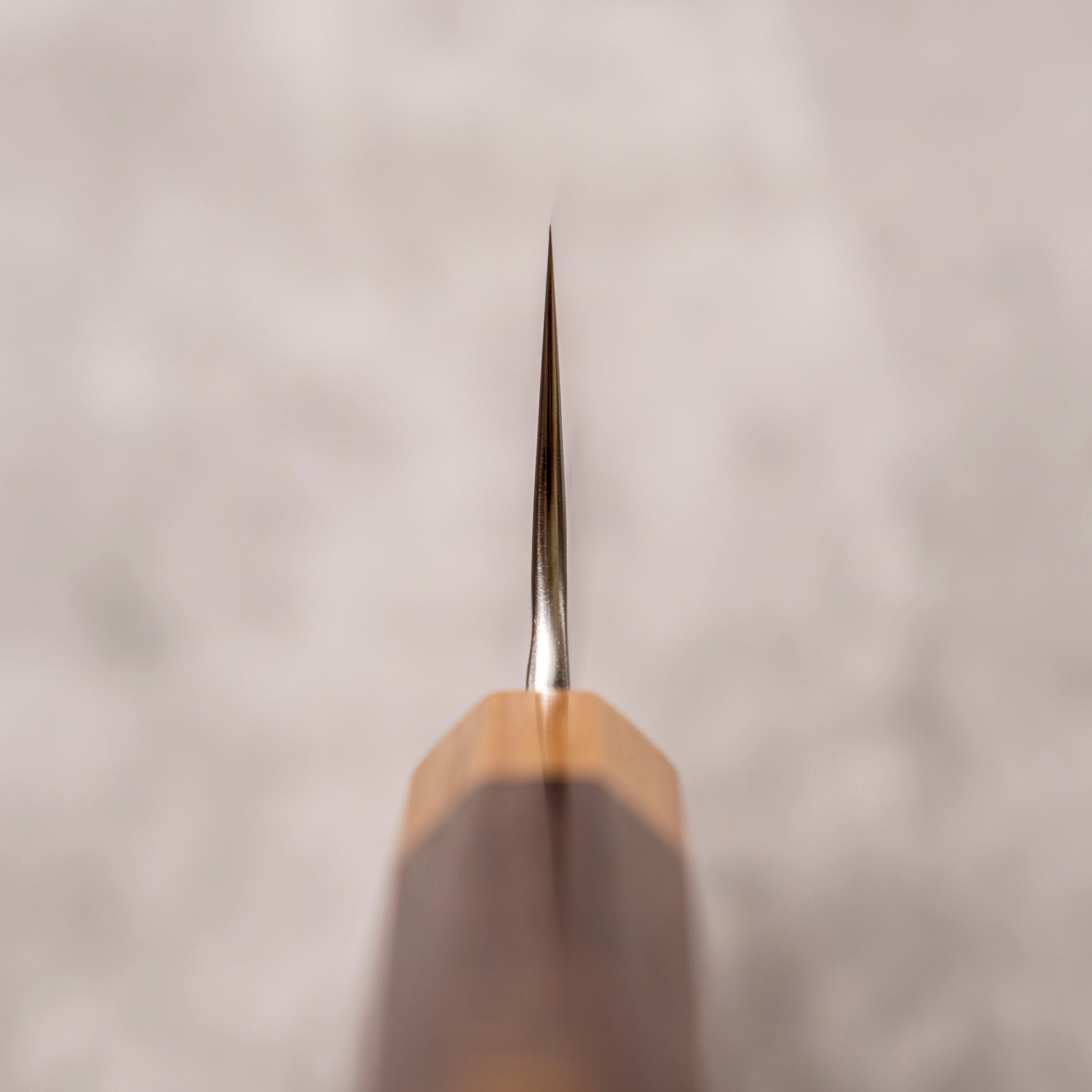 The Bunka is an all purpose shape that is very similar to the ever versatile santoku. With its more aggressive K-tip, or reverse tanto tip, these guys can do everything the santoku can, but excel in finer tip work for things like brunoise shallots and garlic. These knives are a surprising joy to thin and work on, despite the stainless cladding, and the tall bevels give them a great cutting feel through harder ingredients like carrots and sweet potatoes.