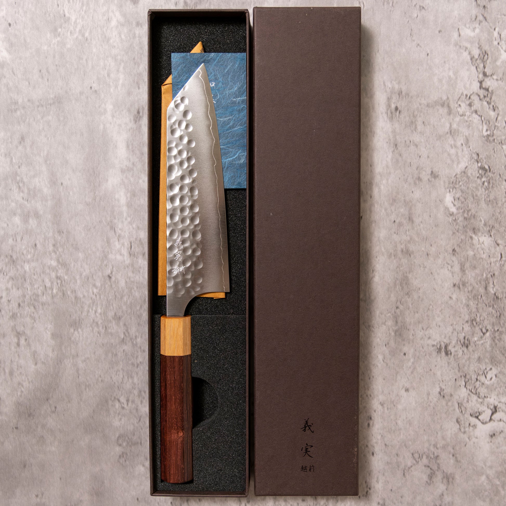Yoshimi Kato works out of the Takefu Knife village and took over the Family business from his father in-law in 2013. His Father in-law Hiroshi Kato-san started the shop in the late 1960's and was inaugurated as the 4th Chairman of the Takefu Knife village in 1994. Making incredible knives runs in the family obviously and we're very excited to have these incredibly sharp knives in our shop. They have one of the most beautiful tsuchime patterns we have ever seen and are sharpened by famous knife sharpener Makoto Kurosaki; brother of one of our favorite knifemakers Yu Kurosaki.